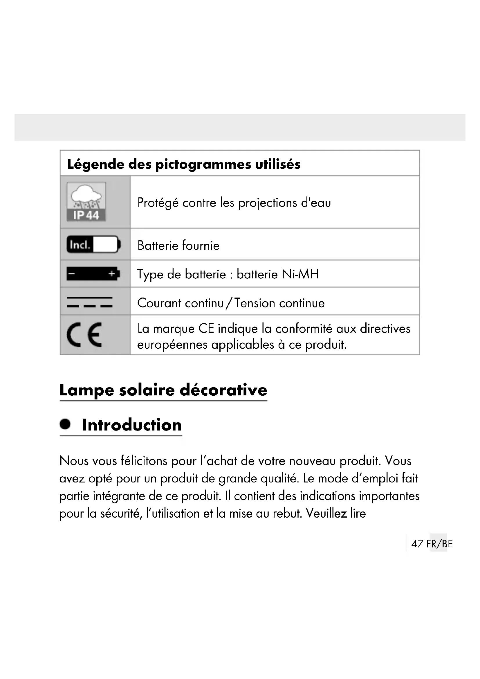 600 mAh) Pour HG05660C : 1 x pile Ni-MH (2/3 AAA / 1,2 V / 300 mAh) LED : 1 x LED50 FR/BE Puissance nominale : 11 mW pour HG05660A 18 mW pour HG05660B 11 mW pour HG05660C Protection: IP44 (projections d‘eau) Durée d‘éclairage (lorsque la pile entièrement chargée) : env. 8 heures Consignes de sécurité VEUILLEZ LIRE LE MODE D’EMPLOI AVANT UTILISATION! LE MODE D‘EMPLOI EST À CONSERVER SOIGNEUSEMENT! LORSQUE VOUS REMETTEZ LE PRODUIT À D‘AUTRES UTILI-