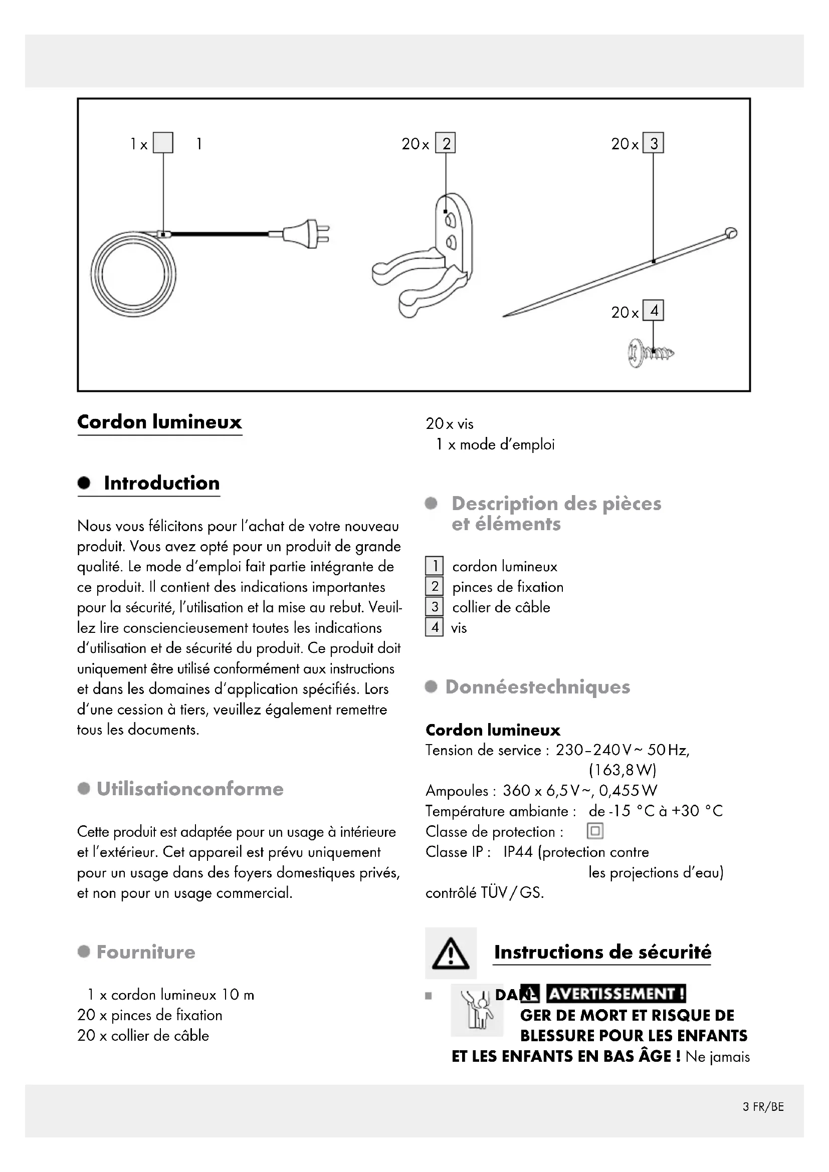 CORDON LUMINEUX LICHTERSCHLAUCH Bedienungs- und Sicherheitshinweise CORDON LUMINEUX Instructions d‘utilisation et consignes de sécurité LICHTSLANG Bedienings- en veiligheidsinstructies IAN 277791FR / BE Instructions d‘utilisation et consignes de sécurité Page 3 NL / BE Bedienings- en veiligheidsinstructies Pagina 8 DE / AT / CH Bedienungs- und Sicherheitshinweise Seite 123 FR/BE Cordon lumineux Introduction Nous vous félicitons pour l‘achat de votre nouveau produit. Vous avez opté pour un produit de grande qualité. Le mode d‘emploi fait partie intégrante de ce produit. Il contient des indications importantes pour la sécurité, l’utilisation et la mise au rebut. Veuil- lez lire consciencieusement toutes les indications d‘utilisation et de sécurité du produit. Ce produit doit uniquement être utilisé conformément aux instructions et dans les domaines d‘application spécifiés. Lors d‘une cession à tiers, veuillez également remettre tous les documents. Utilisation conforme Cette produit est adaptée pour un usage à intérieure et l’extérieur. Cet appareil est prévu uniquement pour un usage dans des foyers domestiques privés, et non pour un usage commercial. Fourniture 1 x cordon lumineux 10 m 20 x pinces de fixation 20 x collier de câble 20 x vis 1 x mode d’emploi