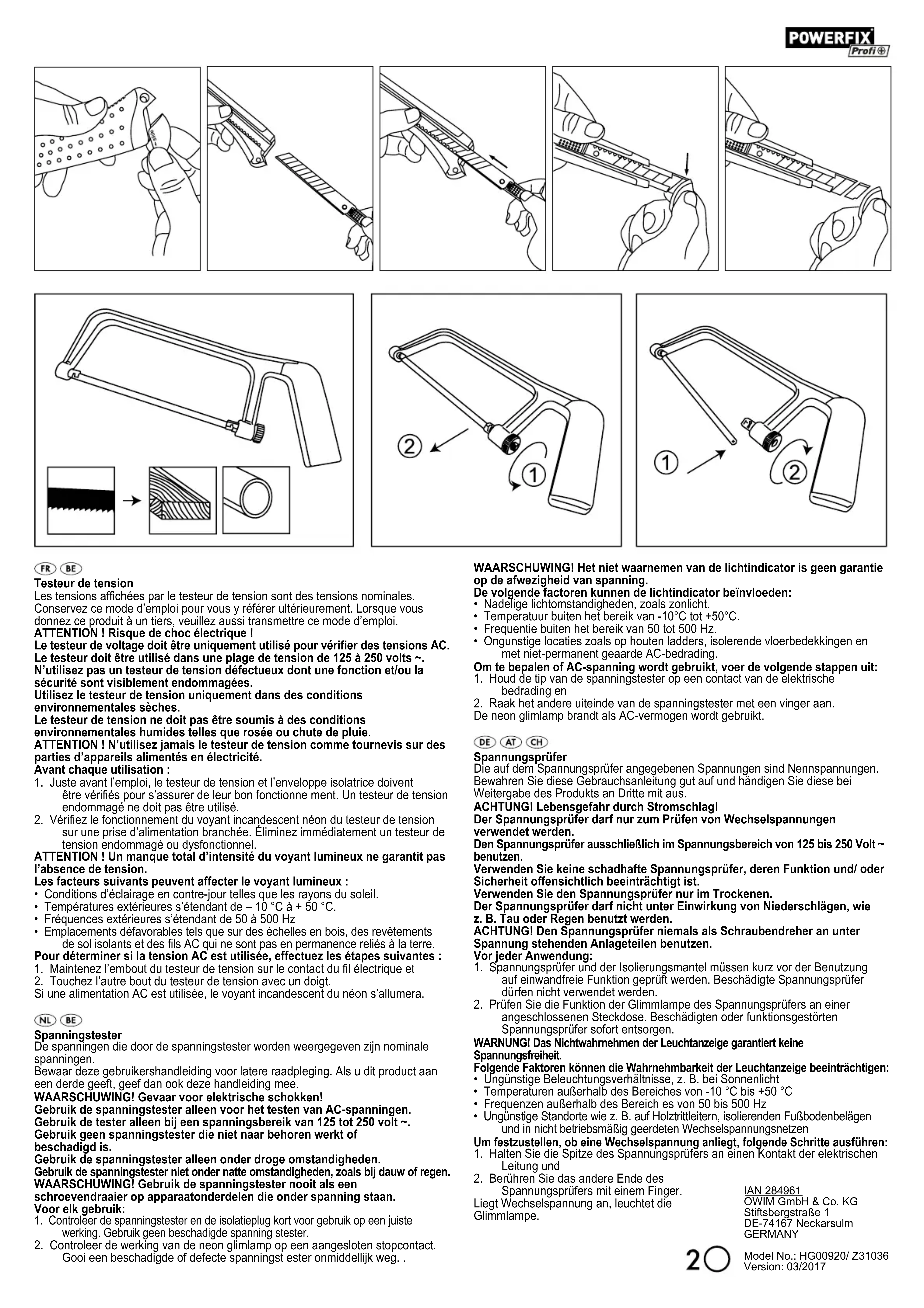 Testeur de tension Les tensions afchées par le testeur de tension sont des tensions nominales. Conservez ce mode d’emploi pour vous y référer ultérieurement. Lorsque vous donnez ce produit à un tiers, veuillez aussi transmettre ce mode d’emploi. ATTENTION ! Risque de choc électrique ! Le testeur de voltage doit être uniquement utilisé pour vérier des tensions AC. Le testeur doit être utilisé dans une plage de tension de 125 à 250 volts ~. N’utilisez pas un testeur de tension défectueux dont une fonction et/ou la sécurité sont visiblement endommagées. Utilisez le testeur de tension uniquement dans des conditions environnementales sèches. Le testeur de tension ne doit pas être soumis à des conditions environnementales humides telles que rosée ou chute de pluie. ATTENTION ! N’utilisez jamais le testeur de tension comme tournevis sur des parties d’appareils alimentés en électricité. Avant chaque utilisation :