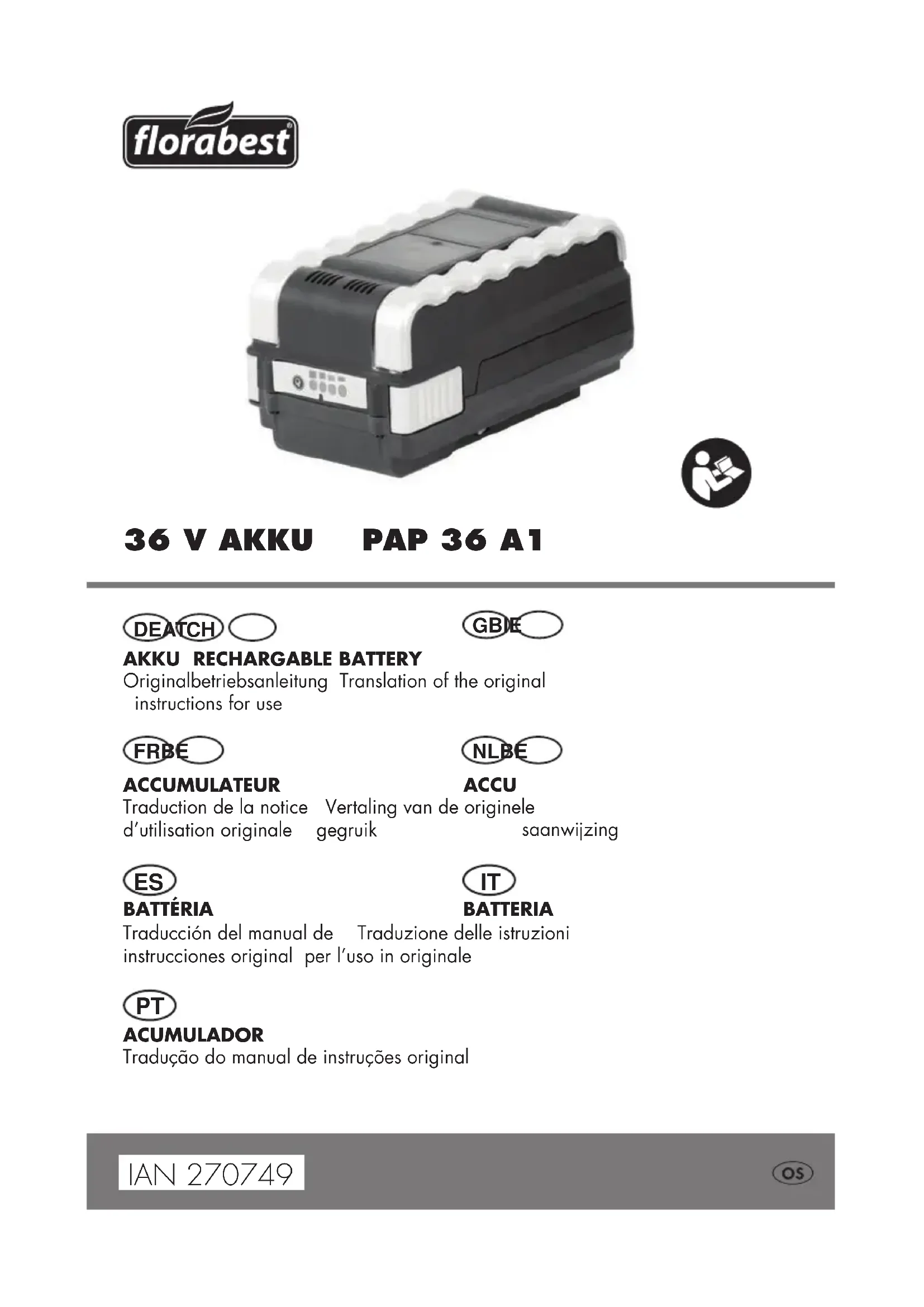 - Defectiveunitsreturnedtouswillbedisposedofforfree.4 FR BE 36 V Accumulateur (Li-Ion) PAP 36 A1 Fins d‘utilisation : Labatteriedoitêtreuniquementutiliséeaveclesappareilssuivants: - TondeuseàaccumulateurdetypeFRMA36/1A1(IAN274755) - TondeuseàaccumulateurdetypeFRMA36/2A1(IAN270611) Données techniques : Nombre de cellules de batterie ............20 Tension nominale ....................... 36V Capacité ............................... 2600mAh Énergie ....................................93,6Wh Tempsdecharge .........................env.1h Symboles sur l’accumulateur : MAX. 60°C MAX. 60°C MAX. 60°C Li-Ion