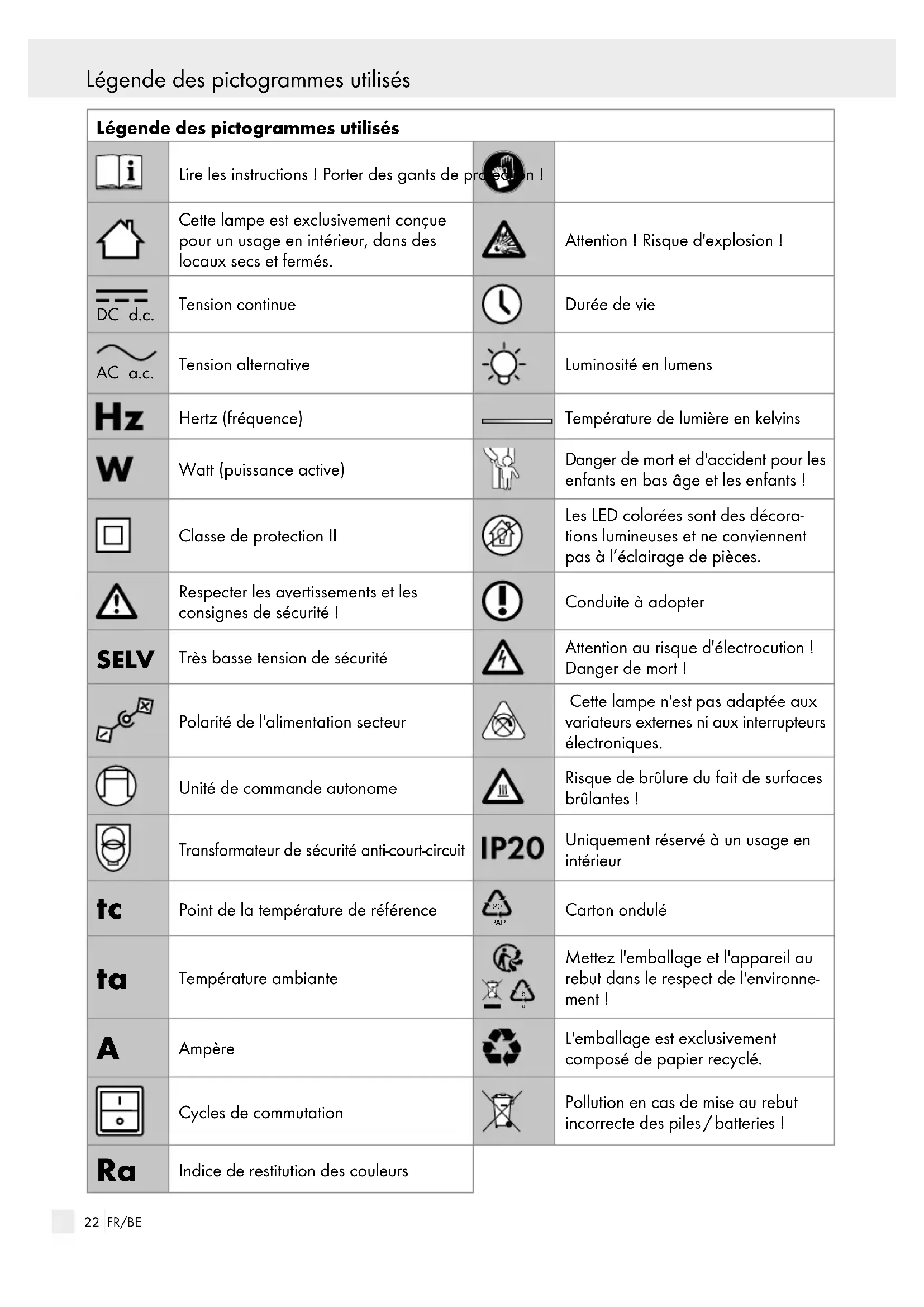 FANTS EN BAS ÂGE ET LES ENFANTS! Ne laissez jamais les enfants manipuler sans surveillance le matériel d‘emballage. Ils risquent de s‘étouffer avec les matériaux d‘emballage. Les enfants sous-estiment souvent les dangers. Ne laissez pas la lampe ou le matériel d‘em- ballage traîner sans surveillance. Les films et les sachets en plastique, les éléments en plastique, etc. peuvent devenir des jouets dangereux dans les mains des enfants. Cet appareil peut être utilisé par des enfants âgés de 8 ans et plus ainsi que par des personnes ayant des capacités physiques, sensorielles ou mentales réduites ou manquant d‘expérience ou de connaissances, s‘ils sont surveillés ou s‘ils ont été informés de l‘utilisation sûre de l‘appareil et comprennent les risques liés à son utilisation. Les enfants ne doivent pas jouer avec l‘appareil. Le nettoyage et l‘entretien ne doivent pas être effectués par des enfants laissés sans surveil- lance. Évitez les risques mortels par électrocution Avant chaque utilisation, contrôlez le bon état de la lampe. N‘utilisez jamais la lampe si vous constatez le moindre dommage. Une lampe endommagée implique un danger de mort par électrocution. En cas de dommages, de réparations à effectuer ou d‘autres problèmes, veuillez contacter le service après-vente ou un électricien. Avant utilisation, assurez-vous que la tension de secteur à disposition correspond à la tension de service nécessaire pour la lampe (voir «Carac- téristiques techniques»). Évitez impérativement tout contact de la lampe avec de l‘eau ou d‘autres liquides. Débranchez toujours l‘adaptateur secteur de la prise de courant avant le montage, le démon- tage, le nettoyage ou si vous n‘utilisez pas la lampe pendant une certaine durée. N‘ouvrez jamais les équipements électriques et n‘y insérez jamais d‘objets. De telles interventions impliquent un danger de mort par choc élec- trique. La source lumineuse de cette lampe n‘est pas remplaçable. Lorsque la source lumineuse ar- rive en fin de vie, l‘ensemble de la lampe doit être remplacé. Cette lampe n‘est pas adaptée aux variateurs externes ni aux interrup- teurs électroniques. Les LED colorées sont un éclairage décoratif. Elles ne conviennent pas à l‘éclairage de pièces. Évitez les risques d‘incendie et de blessures Lorsque la source lumineuse est allumée, évitez de la regarder de trop près. Ne pas regarder les LED avec un instrument optique (par exemple une loupe). Certaines personnes peuvent être sujettes à l‘épilepsie ou à des troubles de la conscience lorsqu‘elles sont soumises à des flashes ou à des effets lumineux. En cas de symptômes épilepti ques, veuillez immédiatement appeler un médecin. Ne couvrez pas la lampe ou l‘adaptateur secteur avec des objets. Un dégagement de chaleur excessif peut provoquer un incendie. Ne faites pas fonctionner le produit dans son emballage. Dans le cas contraire, il existe un risque de surchauffe! Ne laissez jamais fonctionner la lampe sans surveillance. Sécurité / Préparation / Mise en service25 FR/BE Sécurité Sécurité / Préparation / Mise en service Conduite à adopter Montez la lampe de telle sorte qu‘elle soit protégée de l‘humidité et des salissures. Soyez toujours vigilant! Faites toujours attention à ce que vous faites et agissez toujours raison- nablement. N‘effectuez jamais le montage de la lampe et ne l‘utilisez pas si vous n‘êtes pas concentré ou si vous vous sentez mal. Afin de couper complètement la lampe de l‘ali- mentation électrique, l‘adaptateur secteur doit être débranché de la prise. Consignes de sécurité relatives aux piles / aux piles rechargeables DANGER DE MORT! Rangez les piles / piles rechargeables hors de la portée des enfants. En cas d’ingestion, consultez immédiatement un médecin ! RISQUE D‘EXPLOSION ! Ne rechargez jamais des piles non rechar- geables. Ne court-circuitez pas les piles / piles rechargeables et / ou ne les ouvrez pas ! Autre- ment, vous risquez de provoquer une sur- chauffe, un incendie ou une explosion. Ne jetez jamais des piles / piles rechargeables au feu ou dans l’eau. Ne pas soumettre les piles / piles rechargeables à une charge mécanique. Risque de fuite des piles / piles rechargeables Évitez d’exposer les piles / piles rechargeables à des conditions et températures extrêmes sus- ceptibles de les endommager, par ex. sur des radiateurs / exposition directe aux rayons du soleil. Lorsque les piles / piles rechargeables fuient, évitez tout contact du produit chimique avec la peau, les yeux ou les muqueuses! Rincez les zones touchées à l‘eau claire et consultez im- médiatement un médecin !
