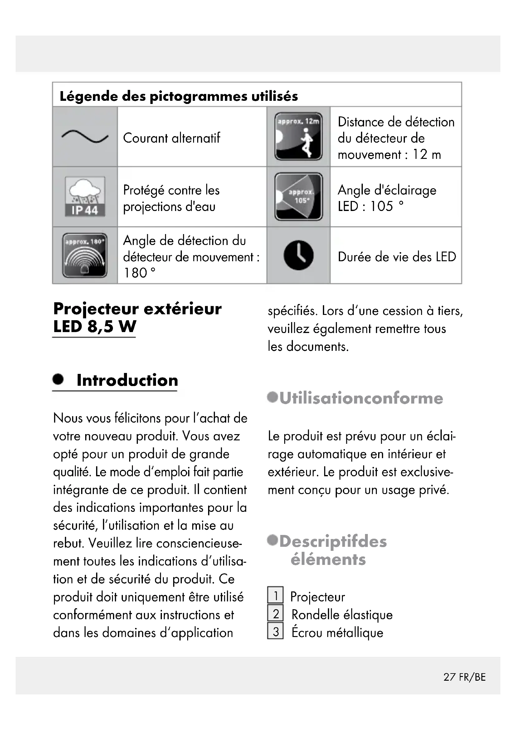 Veuillez respecter l‘iden- tification des matériaux d‘emballage pour le tri sélectif, ils sont identifiés avec des abbréviations (a) et des chiffres (b) ayant la signification suivante : 1–7 : plastiques / 20–22 : papiers et cartons / 80–98 : matériaux composite. Le produit et les maté- riaux d’emballage sont recyclables, mettez-les au rebut séparément pour un meil- leur traitement des déchets. Le logo Triman n’est valable qu’en France. Votre mairie ou votre municipalité vous rensei- gneront sur les possibilités de mise au rebut des produits usagés. Afin de contribuer à la protection de l’environ- nement, veuillez ne pas jeter votre produit usagé dans les ordures ménagères, mais éliminez-le de manière appropriée. Pour obtenir des renseignements concernant les points de collecte et leurs horaires d’ouverture, vous pouvez contacter votre municipalité. Garantie Le produit a été fabriqué selon des critères de qualité stricts et contrôlé consciencieusement avant sa livrai- son. En cas de défaillance, vous êtes en droit de retourner ce produit au vendeur. La présente garantie ne constitue pas une restriction de vos droits légaux. Ce produit bénéficie d‘une garantie de 3 ans à compter de sa date d’achat. La durée de garantie dé- bute à la date d’achat. Veuillez conserver le ticket de caisse original. Il fera office de preuve d’achat.36 FR/BE Si un problème matériel ou de fabrication devait survenir dans 3 ans suivant la date d‘achat de ce produit, nous assurons à notre discrétion la réparation ou le rem- placement du produit sans frais supplémentaires. La garantie prend fin si le produit est endommagé suite à une utilisation inappropriée ou à un entretien défaillant. La garantie couvre les vices maté- riels et de fabrication. Cette garantie ne s’étend ni aux pièces du produit soumises à une usure normale (p. ex. des piles) et qui, par conséquent, peuvent être considérées comme des pièces d’usure, ni aux dommages sur des composants fragiles, comme des interrupteurs, des batteries ou des éléments fabriqués en verre.37 NL/BE Legenda van de gebruikte pictogrammen ................................................................... Pagina 38 Inleiding ................................................................................. Pagina 38 Correct gebruik ......................................................................... Pagina 38 Beschrijving van de onderdelen ............................................... Pagina 38 Technische gegevens ................................................................ Pagina 39 Omvang van de levering .......................................................... Pagina 39 Algemene veiligheidsinstructies ........................ Pagina 39 Voor de montage ........................................................... Pagina 41 Voor de ingebruikname ........................................... Pagina 42 Montage ................................................................................. Pagina 42 Ingebruikname ................................................................ Pagina 43 Bewegingsmelder instellen ....................................................... Pagina 43 Verlichtingsduur instellen .......................................................... Pagina 44 Gevoeligheid van de sensor instellen ...................................... Pagina 44 Daglichtniveau instellen ............................................................ Pagina 44 Bewegingsmelder instellen ....................................................... Pagina 44 Reiniging en onderhoud ........................................... Pagina 45 Afvoer ...................................................................................... Pagina 45 Garantie ................................................................................. Pagina 4638 NL/BE Legenda van de gebruikte pictogrammen Wisselstroom Detectie-afstand bewegingsmelder: 12 m Spatwaterdicht Lichthoek led: 105 ° Detectiehoek bewe- gingsmelder: 180 ° Led-levensduur LED-buitenschijnwerper 8,5 W Inleiding Hartelijk gefeliciteerd met de aan- koop van uw nieuwe product. U heeft voor een hoogwaardig pro- duct gekozen. De gebruiksaanwij- zing is een deel van het product. Deze bevat belangrijke aanwijzin- gen voor veiligheid, gebruik en verwijdering. Maakt U zich voor de ingebruikname van het product met alle bedienings- en veiligheids- voorschriften vertrouwd. Gebruik het product alleen zoals beschreven en voor de aangegeven toepassingsgebieden. Overhandig alle documenten bij doorgifte van het product aan derden. Correct gebruik Het product is bedoeld voor auto- matische verlichting binnens- en buitenshuis. Het product is uitslui- tend bestemd voor privégebruik. Beschrijving van de onderdelen