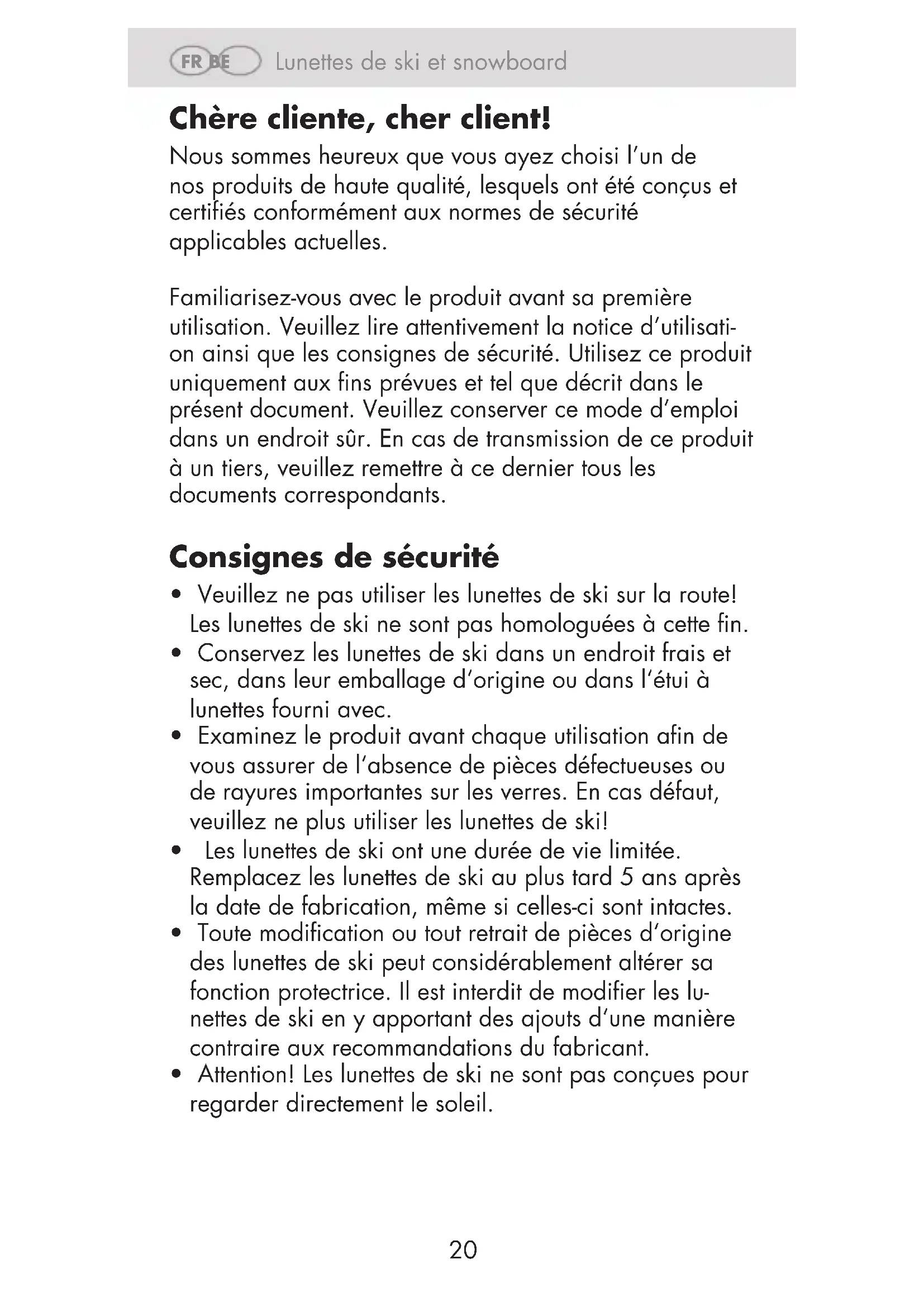 - Examinez le produit avant chaque utilisation afin de vous assurer de l'absence de pieces défectueuses ou de rayures importantes sur les verres. En cas défaut, veuillez ne plus utiliser les lunettes de ski!