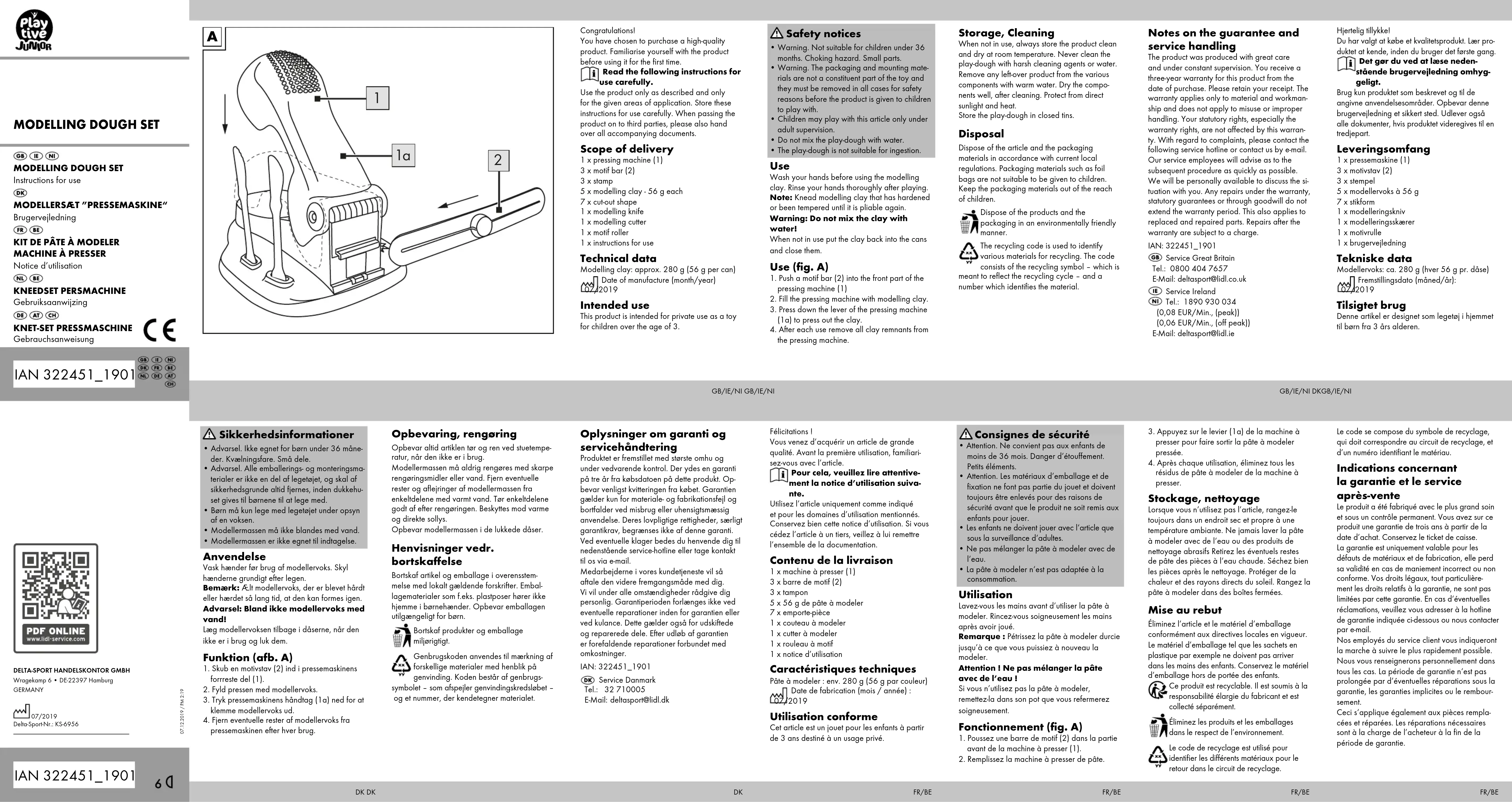 - Attention. Ne convient pas aux enfants de moins de 36 mois. Danger d’étouffement. Petits éléments.• Attention. Les matériaux d’emballage et de fixation ne font pas partie du jouet et doivent toujours être enlevés pour des raisons de sécurité avant que le produit ne soit remis aux enfants pour jouer.• Les enfants ne doivent jouer avec l‘article que sous la surveillance d‘adultes.• Ne pas mélanger la pâte à modeler avec de l‘eau.• La pâte à modeler n‘est pas adaptée à la consommation. Utilisation Lavez-vous les mains avant d’utiliser la pâte à modeler. Rincez-vous soigneusement les mains après avoir joué.Remarque : Pétrissez la pâte à modeler durcie jusqu’à ce que vous puissiez à nouveau la modeler.Attention ! Ne pas mélanger la pâte avec de l’eau !Si vous n’utilisez pas la pâte à modeler, remettez-la dans son pot que vous refermerez soigneusement. Fonctionnement (fig. A) 1. Poussez une barre de motif (2) dans la partie avant de la machine à presser (1).2. Remplissez la machine à presser de pâte.FR/BE FR/BE3. Appuyez sur le levier (1a) de la machine à presser pour faire sortir la pâte à modeler pressée.4. Après chaque utilisation, éliminez tous les résidus de pâte à modeler de la machine à presser. Stockage, nettoyage Lorsque vous n’utilisez pas l’article, rangez-le toujours dans un endroit sec et propre à une température ambiante. Ne jamais laver la pâte à modeler avec de l‘eau ou des produits de nettoyage abrasifs Retirez les éventuels restes de pâte des pièces à l‘eau chaude. Séchez bien les pièces après le nettoyage. Protéger de la chaleur et des rayons directs du soleil. Rangez la pâte à modeler dans des boîtes fermées. Mise au rebut Éliminez l’article et le matériel d’emballage conformément aux directives locales en vigueur. Le matériel d’emballage tel que les sachets en plastique par exemple ne doivent pas arriver dans les mains des enfants. Conservez le matériel d’emballage hors de portée des enfants. Ce produit est recyclable. Il est soumis à la responsabilité élargie du fabricant et est collecté séparément.Éliminez les produits et les emballages dans le respect de l’environnement.Le code de recyclage est utilisé pour identifier les différents matériaux pour le retour dans le circuit de recyclage.