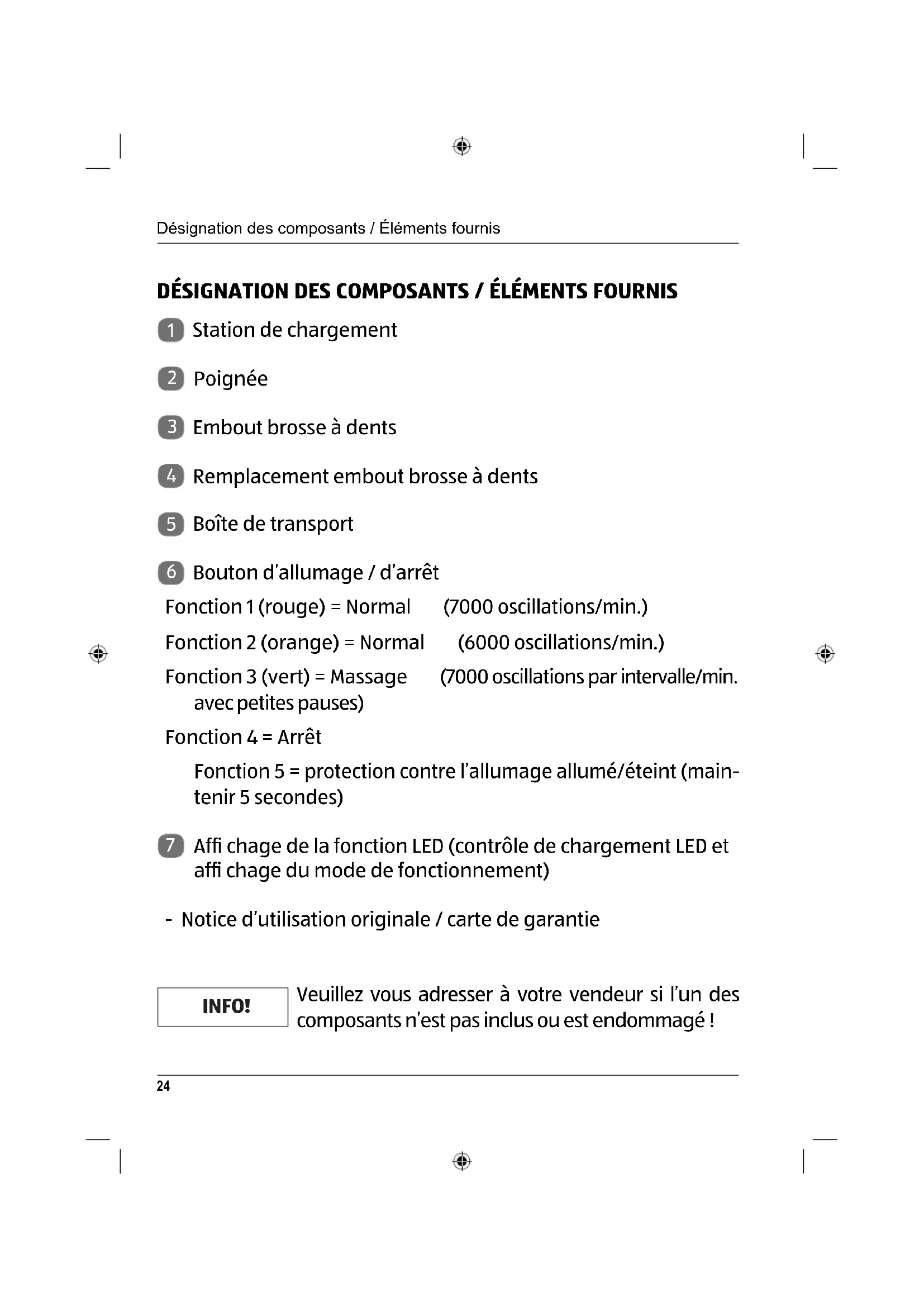 clignote en vert) Fonction 4 = Arrêt Fonction 5 = protection contre l’allumage allumé/éteint ( bouton de fonctionnement maintenir 5 secondes) INFO! La désactivation se fait aussi par positionnement sur la station de chargement déjà prête à fonctionner. Utilisation34 INFO! Fonctions 1 et 2 : La brosse à dents oscille et fait une courte pause après env. 30 secondes. Si vous répar- tissez vos dents en 4 segments de nettoyage et brossez chaque seg- ment pendant 30 secondes, vous arriverez à la durée de nettoyage recommandée et équilibrée de 2 minutes. La brosse à dents s’éteint après 2 minutes et peu en cas de besoin être redémarrée. Fonction 3 : La brosse à dents oscille à intervalles et fait une courte pause après env. 30 secondes. Elle s’arrête également après 2 mi- nutes et peut être redémarrée. Fonction 4 : La brosse à dents peut être déconnectée de chaque fonction en appuyant de façon répétée sur les boutons de fonction allumer / éteindre