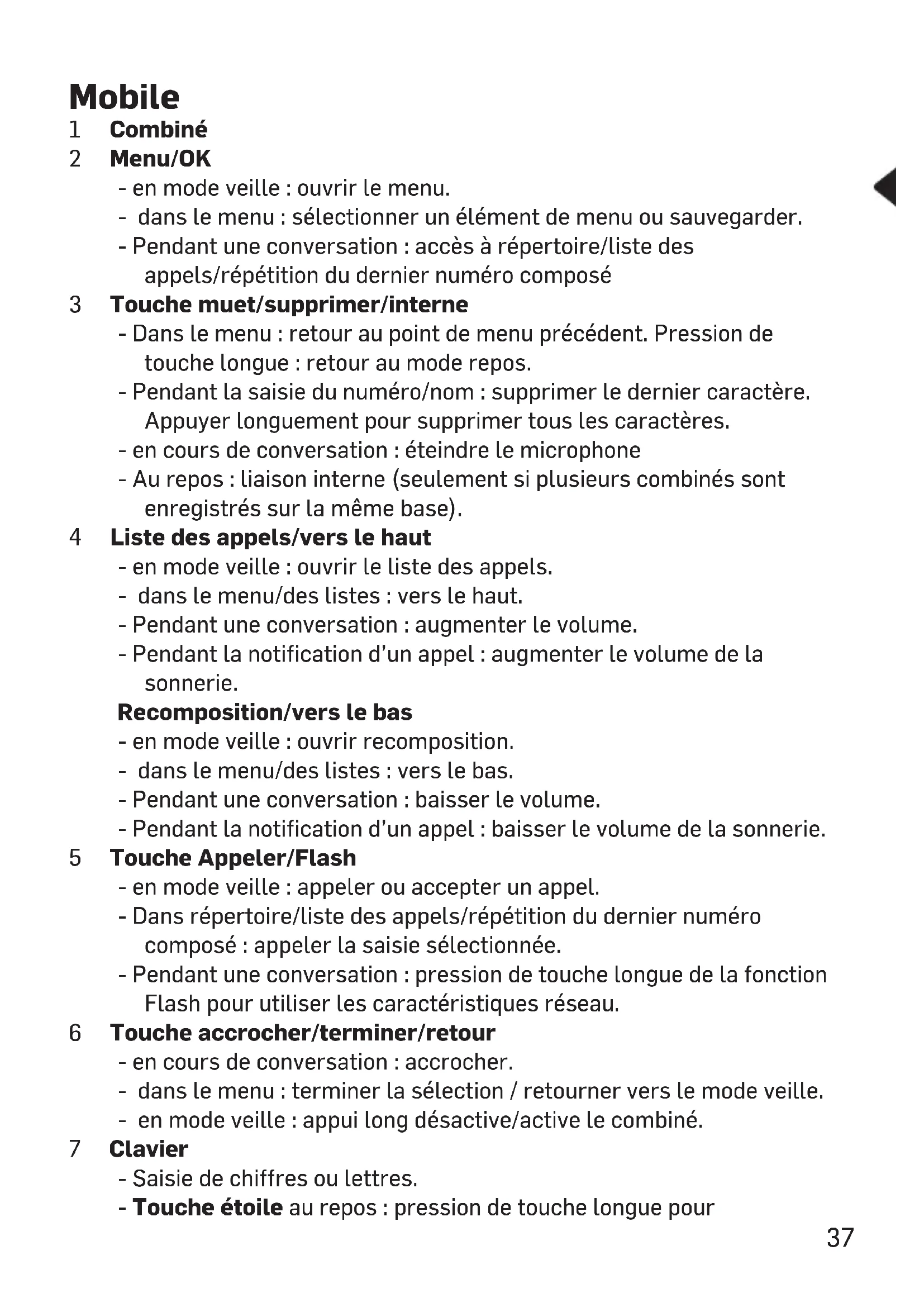 3 4Mobile 1 Combiné 2 Menu/OK - en mode veille : ouvrir le menu. - dans le menu : sélectionner un élément de menu ou sauvegarder. - Pendant une conversation : accès à répertoire/liste des appels/répétition du dernier numéro composé 3 Touche muet/supprimer/interne - Dans le menu : retour au point de menu précédent. Pression de touche longue : retour au mode repos. - Pendant la saisie du numéro/nom : supprimer le dernier caractère. Appuyer longuement pour supprimer tous les caractères. - en cours de conversation : éteindre le microphone - Au repos : liaison interne (seulement si plusieurs combinés sont enregistrés sur la même base). 4 Liste des appels/vers le haut - en mode veille : ouvrir le liste des appels. - dans le menu/des listes : vers le haut. - Pendant une conversation : augmenter le volume. - Pendant la notification d’un appel : augmenter le volume de la sonnerie. Recomposition/vers le bas - en mode veille : ouvrir recomposition. - dans le menu/des listes : vers le bas. - Pendant une conversation : baisser le volume. - Pendant la notification d’un appel : baisser le volume de la sonnerie. 5 Touche Appeler/Flash - en mode veille : appeler ou accepter un appel. - Dans répertoire/liste des appels/répétition du dernier numéro composé : appeler la saisie sélectionnée. - Pendant une conversation : pression de touche longue de la fonction Flash pour utiliser les caractéristiques réseau. 6 Touche accrocher/terminer/retour - en cours de conversation : accrocher. - dans le menu : terminer la sélection / retourner vers le mode veille. - en mode veille : appui long désactive/active le combiné. 7 Clavier - Saisie de chiffres ou lettres. - Touche étoile au repos : pression de touche longue pour 37activer/désactiver le verrouillage des touches. Dans liste des appels : Affichage des chiffres restants du numéro de l’appelant (s’il comporte plus de 12 chiffres). - Touche dièse en état de veille : pression de touche longue pour acti- ver/désactiver la sonnerie. Lors de la saisie d’un numéro de téléphone : pression de touche longue pour saisir une pause (P). 8 Touche haut-parleur - Activer/désactiver le hautparleur. 9 Touche d‘amplification - Pour augmenter le volume du combiné. Une pression brève pendant la conversation active l’amplification. Appuyez encore une fois pour désactiver l‘amplification. 10 Microphone Station de base 1 Contacts de chargement 2 Touche appel - en état de veille : appuyez pour appeler tous les mobiles enregistrés. 3 Raccordement bloc d’alimentation 4 Raccordement ligne téléphonique Contenu de l’emballage Contenu Modèle E1300 E1500 E1502 E1503 Station de base avec bloc d'alimentation 1 1 1 1 Chargeur avec bloc d'alimentation - - 1 2 Combiné 1 1 2 3 Cordon de raccorde-ment du téléphone 1 1 1 1 Accumulateurs 2 2 4 6 Mode d’emploi 1 1 1 1 Emplacement du téléphone Placez la station de base près d’une prise murale et de la prise de raccordement du téléphone afin que la longueur du câble soit suffisante. Garder un écart d’env. 1m aux autres appareils électroniques pour prévenir des interférences mutuelles. La connexion entre station de base et le mobile est assurée par des signaux radio. La puissance du signal dépend du site. La portée maximale est, en vue libre, 300 m ; à l’intérieur, elle est plus courte en raison de murs ou obstacles pareils. 38Raccorder la station de base
