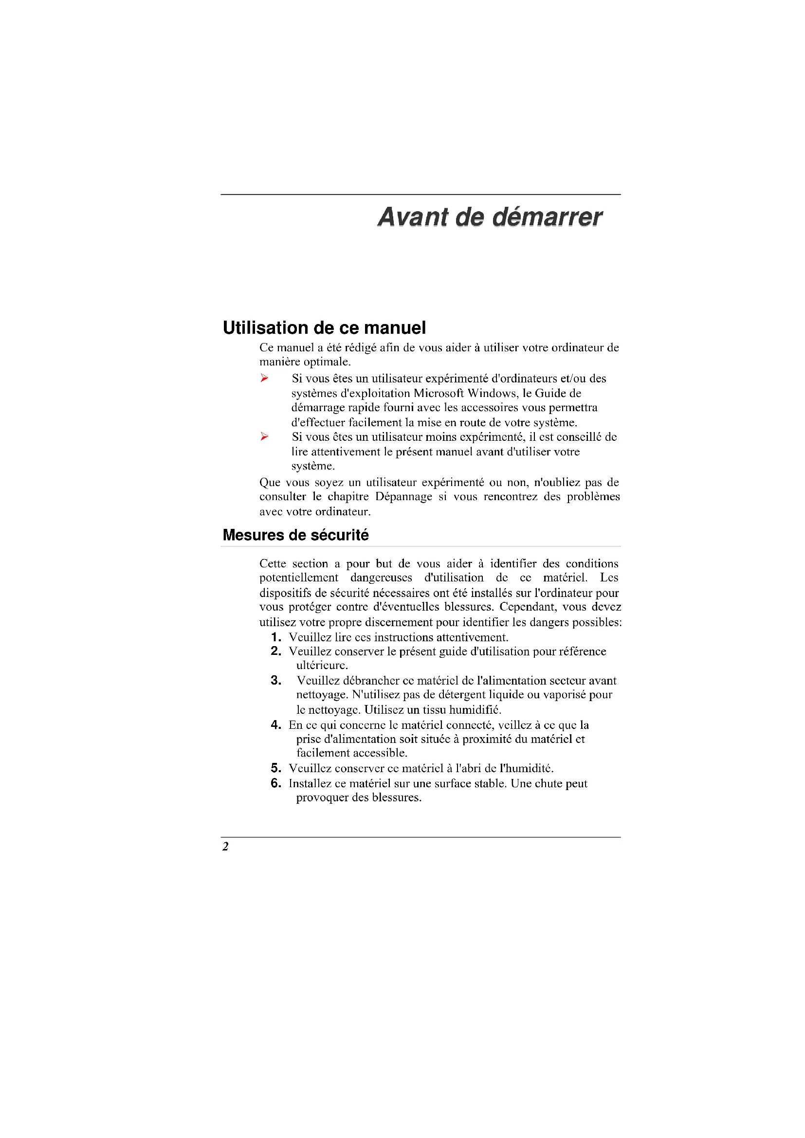 Utilisation de ce manuel Ce manuel a été rédigé afin de vous aider à utiliser votre ordinateur de manière optimale. Si vous êtes un utilisateur expérimenté d'ordinateurs et/ou des systèmes d'exploitation Microsoft Windows, le Guide de démarrage rapide fourni avec les accessoires vous permettra d'effectuer facilement la mise en route de votre système. Si vous êtes un utilisateur moins expérimenté, il est conseillé de lire attentivement le présent manuel avant d'utiliser votre système. Que vous soyez un utilisateur expérimenté ou non, n'oubliez pas de consulter le chapitre Dépannage si vous rencontrez des problèmes avec votre ordinateur. Mesures de sécurité Cette section a pour but de vous aider à identifier des conditions potentiellement dangereuses d'utilisation de ce matériel. Les dispositifs de sécurité nécessaires ont été installés sur l'ordinateur pour vous protéger contre d'éventuelles blessures. Cependant, vous devez utilisez votre propre discernement pour identifier les dangers possibles: