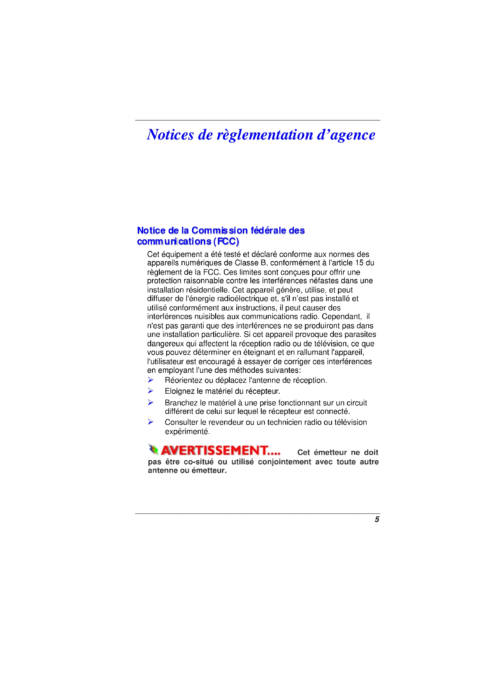 Cet équipement a été testé et déclaré conforme aux normes des appareils numériques de Classe B, conformément à l'article 15 du règlement de la FCC. Ces limites sont conçues pour offrir une protection raisonnable contre les interférences néfastes dans une installation résidentielle. Cet appareil génère, utilise, et peut diffuser de l'énergie radioélectrique et, s'il n’est pas installé et utilisé conformément aux instructions, il peut causer des interférences nuisibles aux communications radio. Cependant, il n'est pas garanti que des interférences ne se produiront pas dans une installation particulière. Si cet appareil provoque des parasites dangereux qui affectent la réception radio ou de télévision, ce que vous pouvez déterminer en éteignant et en rallumant l'appareil, l'utilisateur est encouragé à essayer de corriger ces interférences en employant l'une des méthodes suivantes: Réorientez ou déplacez l'antenne de réception. Eloignez le matériel du récepteur. Branchez le matériel à une prise fonctionnant sur un circuit différent de celui sur lequel le récepteur est connecté. Consulter le revendeur ou un technicien radio ou télévision expérimenté. Cet émetteur ne doit pas être co-situé ou utilisé conjointement avec toute autre antenne ou émetteur.6 Modifications La FCC exige que l’utilisateur soit averti de ce que toutes les modifications ou changements apportés à cet appareil et qui ne sont pas expressément approuvés par le fabricant, peuvent priver l’utilisateur du droit d’utiliser l’équipement. Connexions à des périphériques Les connexions à ce matériel doivent être effectuées à l’aide de câbles blindés avec capuchon de connecteur RFI/EMI métallique afin de maintenir la compatibilité avec les règles et règlementations de la FCC. Exposition SAR La Intel-powered Clamshell Classmate PC a été testée et reconnue conforme aux limites d’exposition RF de la FCC. Pendant de longues périodes d’utilisation l’antenne intégrée située dans le coin supérieur gauche de l’écran d’affichage doit être positionnée à au moins 20 cm des utilisateurs ou des personnes se trouvant à proximité. Déclaration de conformité Ce matériel est conforme à l'Article 15 des Règlements FCC. Son fonctionnement est assujetti aux deux conditions suivantes : (1) Ce matériel ne doit pas engendrer d'interférences nuisibles, et (2) ce matériel doit accepter n'importe qu'elle interférence reçue, y compris les interférences qui pourraient avoir des effets non désirés sur le fonctionnement. Notice Européenne Les produits marqués CE sont conformes à la directive EMC (2004/108/EC) et la directive Basse tension (2006/95/EEC) et la directive R&TTE (1999/5/EC) publiées par la Commission de la Communauté Européenne. La conformité à ces directives implique une conformité aux normes européennes suivantes :
