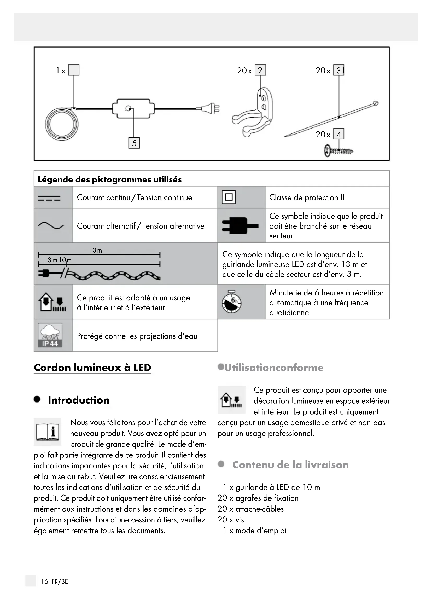 Protégez le produit contre les arêtes coupantes, les charges mécaniques et les surfaces chaudes. Ne pas le fixer avec des agrafes tranchantes ou des clous.18 FR/BE Débranchez toujours la fiche secteur de la prise de courant avant le montage, le démontage ou le nettoyage du produit. Ne touchez jamais la prise ou la guirlande à LED