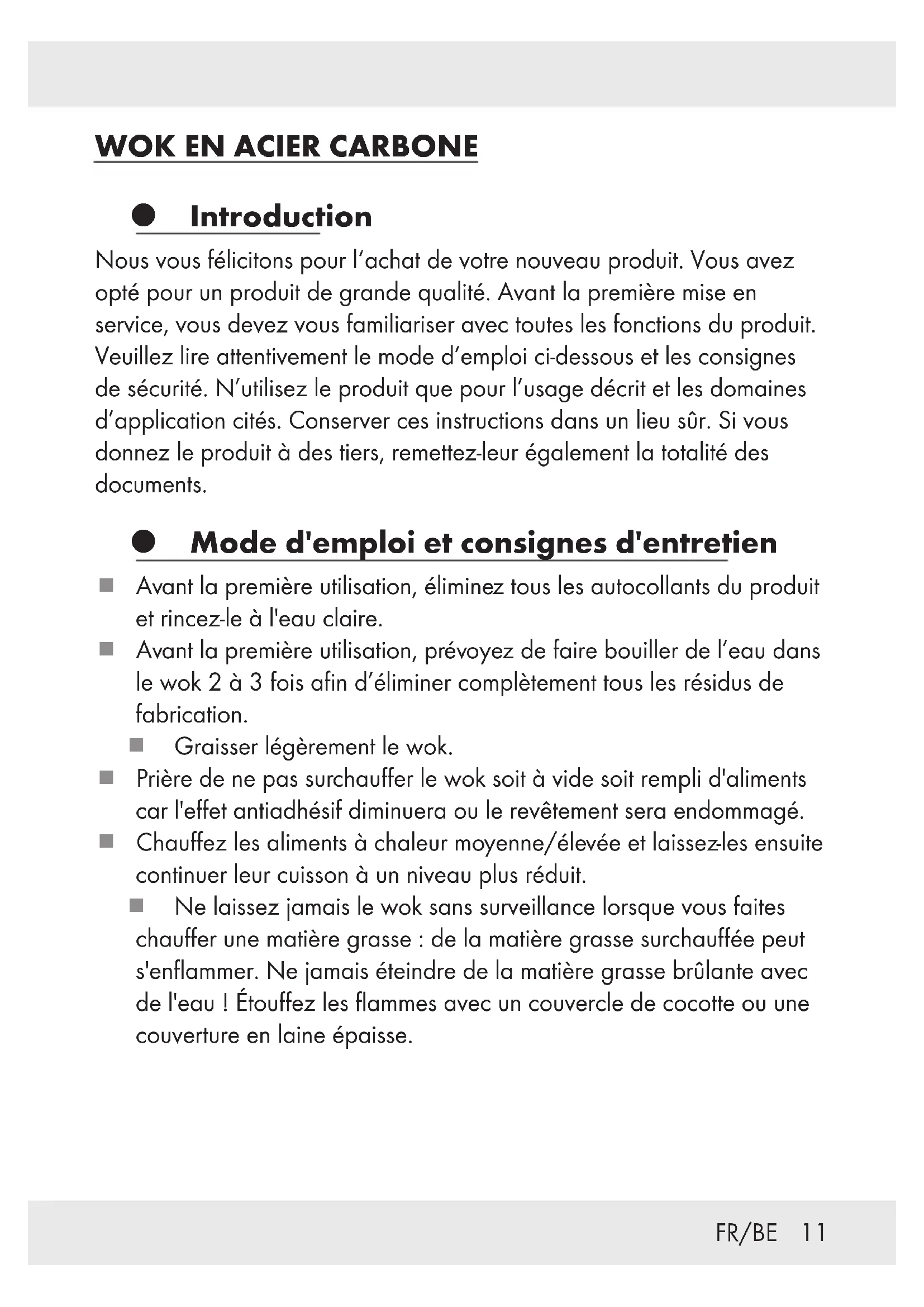 Introduction Nous vous félicitons pour l‘achat de votre nouveau produit. Vous avez opté pour un produit de grande qualité. Avant la première mise en service, vous devez vous familiariser avec toutes les fonctions du produit. Veuillez lire attentivement le mode d’emploi ci-dessous et les consignes de sécurité. N’utilisez le produit que pour l’usage décrit et les domaines d’application cités. Conserver ces instructions dans un lieu sûr. Si vous donnez le produit à des tiers, remettez-leur également la totalité des documents. Mode d'emploi et consignes d'entretien Avant la première utilisation, éliminez tous les autocollants du produit et rincez-le à l'eau claire. Avant la première utilisation, prévoyez de faire bouiller de l’eau dans le wok 2à3fois afin d’éliminer complètement tous les résidus de fabrication. Graisser légèrement le wok. Prière de ne pas surchauffer le wok soit à vide soit rempli d'aliments car l'effet antiadhésif diminuera ou le revêtement sera endommagé. Chauffez les aliments à chaleur moyenne/élevée et laissez-les ensuite continuer leur cuisson à un niveau plus réduit. Ne laissez jamais le wok sans surveillance lorsque vous faites chauffer une matière grasse: de la matière grasse surchauffée peut s'enflammer. Ne jamais éteindre de la matière grasse brûlante avec de l'eau! Étouffez les flammes avec un couvercle de cocotte ou une couverture en laine épaisse.12 FR/BE Afin de ne pas endommager le revêtement antiadhésif, utilisez toujours des ustensiles de cuisine en matière synthétique ou en bois. Ne mettez pas de viande dont le jus coule dans le wok. Des graisses sautant sur une plaque de cuisson brulante peuvent facilement s’enflammer et déclencher un incendie. Durant la cuisson, la poignée/le manche peut chauffer. Pour votre protection, utilisez une manique ou des gants de cuisine. Le wok convient aux cuisinières à gaz et électriques. Le wok ne va pas au four. Ne va pas au four. Pour éviter toute perte de chaleur, choisissez la plaque de cuisson conformément au diamètre du wok. Ce wok ne va pas au lave-vaisselle. Évitez durant l'utilisation tout objet tranchant ou pointu ainsi que l'usage de brosse afin de ne pas endommager le matériau. Prière de ne jamais tenir le produit chaud sous l'eau courante froide. Utilisez de l'eau chaude avec un peu de liquide vaisselle pour nettoyer le produit à la main. Un nettoyage fréquent avec des détergents agressifs peut conduire à des dégâts et/ou une décoloration du wok. Convient aux aliments: Ce wok n'a pas d'influence sur le goût et l'odeur des aliments préparés. N'utilisez jamais le wok si ses poignées sont lâches.13FR/BE Mise au rebut L’emballage se compose de matières recyclables pouvant être mises au rebut dans les déchetteries locales. Votre mairie ou votre municipalité vous renseigneront sur les possibilités de mise au rebut des produits usagés. Le produit est recyclable, soumis à la responsabilité élargie du fabricant et collecté séparément. Garantie Article L217-16 du Code de la consommation Lorsque l‘acheteur demande au vendeur, pendant le cours de la garantie commerciale qui lui a été consentie lors de l‘acquisition ou de la réparation d‘un bien meuble, une remise en état couverte par la garantie, toute période d‘immobilisation d‘au moins sept jours vient s‘ajouter à la durée de la garantie qui restait à courir. Cette période court à compter de la demande d‘intervention de l‘acheteur ou de la mise à disposition pour réparation du bien en cause, si cette mise à disposition est postérieure à la demande d‘intervention. Indépendamment de la garantie commerciale souscrite, le vendeur reste tenu des défauts de conformité du bien et des vices rédhibitoires dans les conditions prévues aux articles L217-4 à L217-13 du Code de la consommation et aux articles 1641 à 1648 et 2232 du Code Civil. Article L217-4 du Code de la consommation Le vendeur livre un bien conforme au contrat et répond des défauts de conformité existant lors de la délivrance. Il répond également des défauts de conformité résultant de l‘emballage, des instructions de montage ou de l‘installation lorsque celle-ci a été mise à sa charge par le contrat ou a été réalisée sous sa responsabilité.14 FR/BE Article L217-5 du Code de la consommation Le bien est conforme au contrat : 1° S´il est propre à l‘usage habituellement attendu d‘un bien semblable et, le cas échéant :