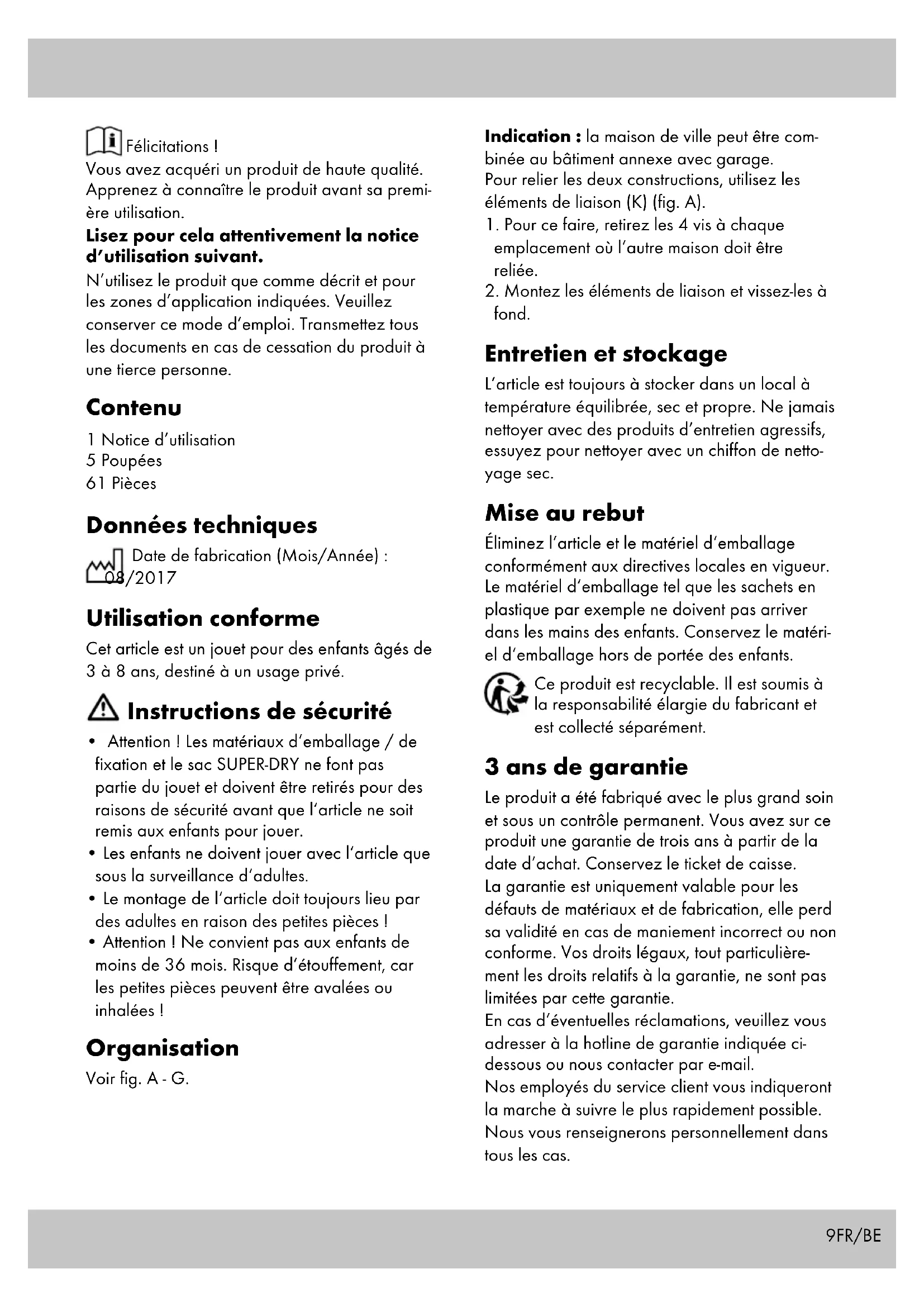 - Attention ! Ne convient pas aux enfants de moins de 36 mois. Risque d’étouffement, car les petites pièces peuvent être avalées ou inhalées ! Organisation Voir fig. A - G. Indication : la maison de ville peut être com- binée au bâtiment annexe avec garage. Pour relier les deux constructions, utilisez les éléments de liaison (K) (fig. A).