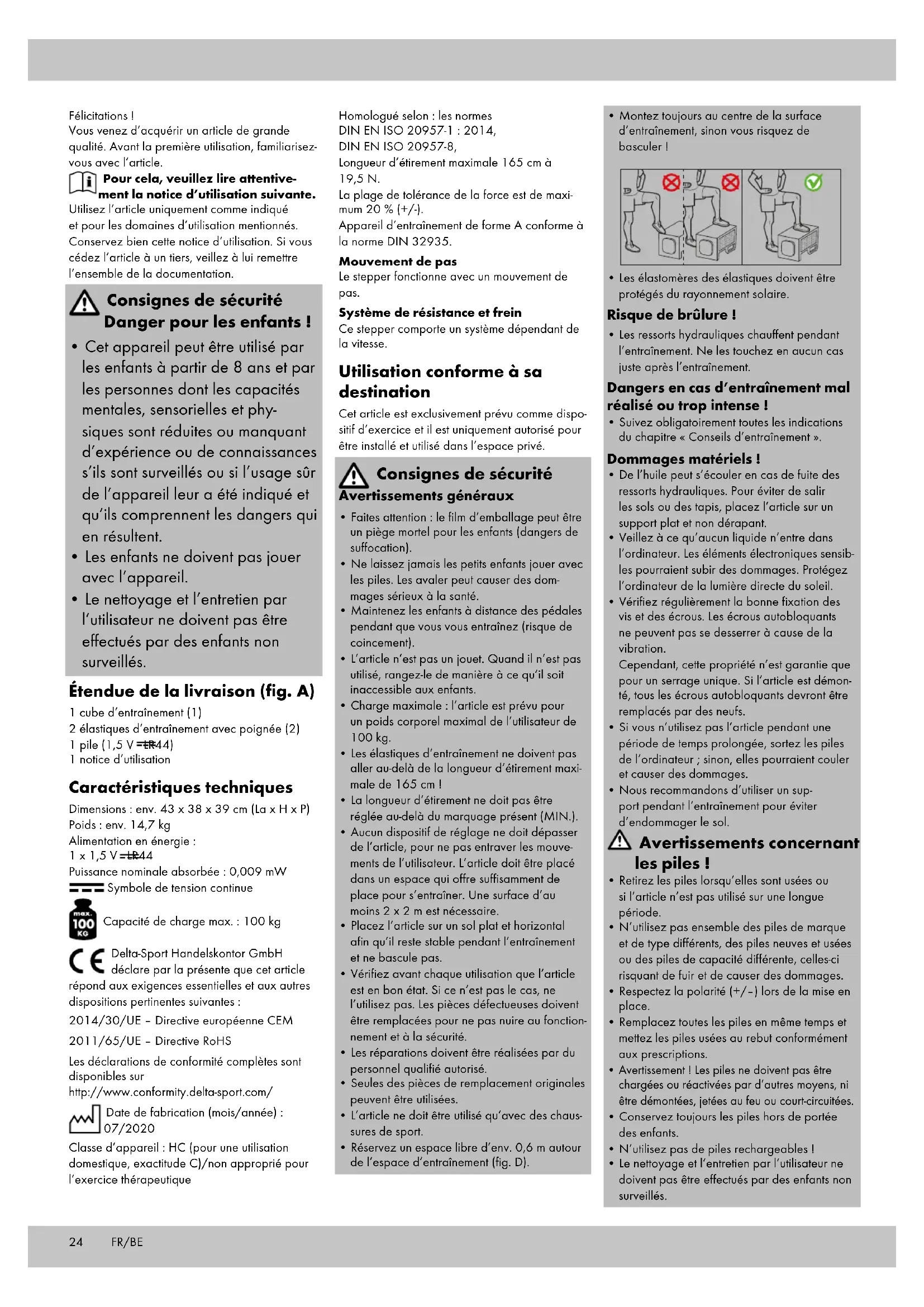 - Le nettoyage et l’entretien par l’utilisateur ne doivent pas être effectués par des enfants non surveillés. Étendue de la livraison (fig. A) 1 cube d’entraînement (1) 2 élastiques d’entraînement avec poignée (2) 1 pile (1,5 V LR44) 1 notice d’utilisation Caractéristiques techniques Dimensions : env. 43 x 38 x 39 cm (La x H x P) Poids : env. 14,7 kg Alimentation en énergie : 1 x 1,5 V LR44 Puissance nominale absorbée : 0,009 mW Symbole de tension continue Capacité de charge max. : 100 kg Delta-Sport Handelskontor GmbH déclare par la présente que cet article répond aux exigences essentielles et aux autres dispositions pertinentes suivantes : 2014/30/UE – Directive européenne CEM 2011/65/UE – Directive RoHS Les déclarations de conformité complètes sont disponibles sur http://www.conformity.delta-sport.com/ Date de fabrication (mois/année) : 07/2020 Classe d’appareil : HC (pour une utilisation domestique, exactitude C)/non approprié pour l’exercice thérapeutique Homologué selon : les normes DIN EN ISO 20957-1 : 2014, DIN EN ISO 20957-8, Longueur d’étirement maximale 165 cm à 19,5 N. La plage de tolérance de la force est de maxi- mum 20 % (+/-). Appareil d’entraînement de forme A conforme à la norme DIN 32935. Mouvement de pas Le stepper fonctionne avec un mouvement de pas. Système de résistance et frein Ce stepper comporte un système dépendant de la vitesse. Utilisation conforme à sa destination Cet article est exclusivement prévu comme dispo- sitif d’exercice et il est uniquement autorisé pour être installé et utilisé dans l’espace privé. Consignes de sécurité Avertissements généraux