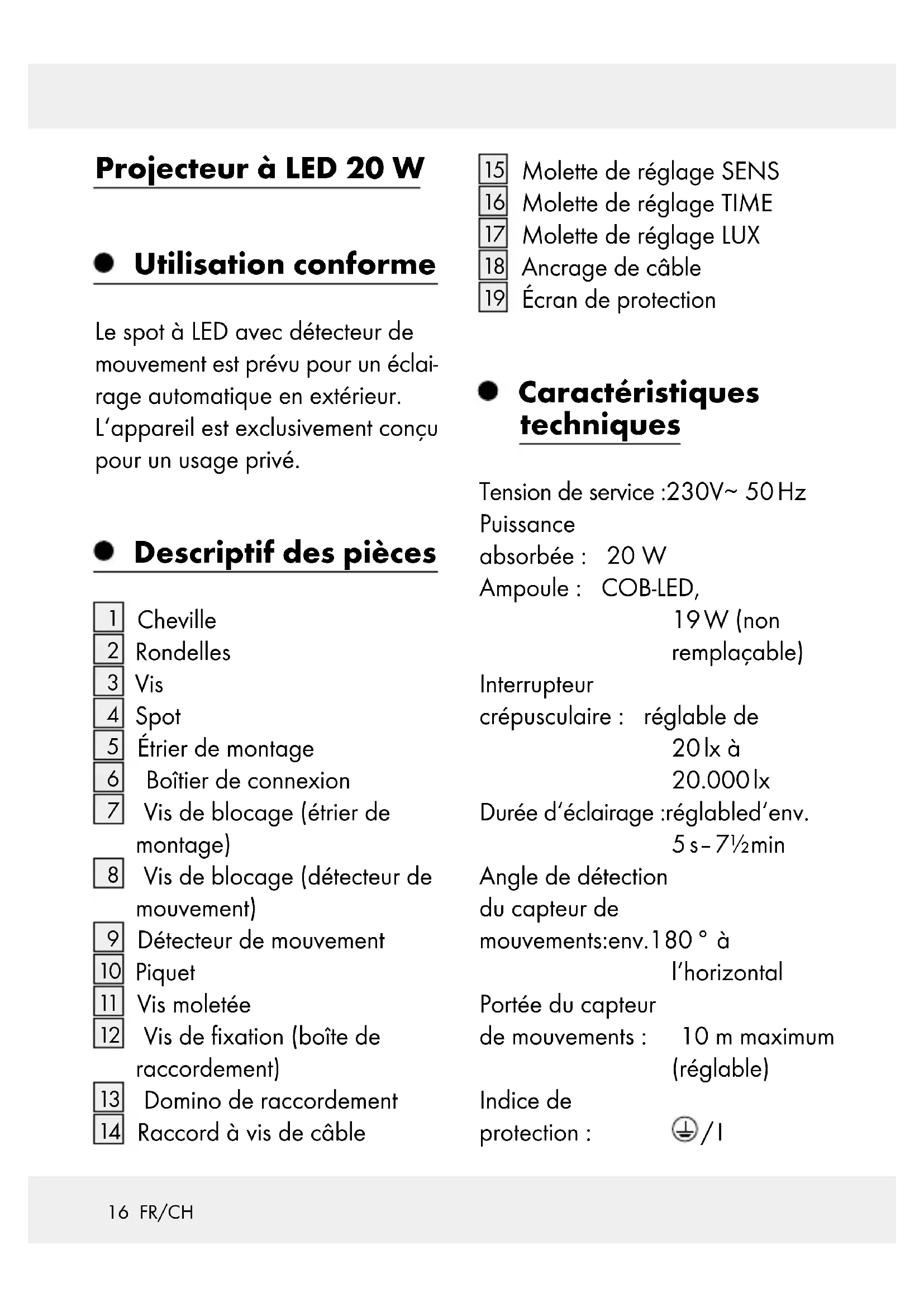 ou l‘orientation du détecteur de mouvement. Si vous avez orienté correcte- ment le détecteur de mouve- ment, serrez à nouveau la vis de blocage afin de fixer le ré- glage. Nettoyage et entretien Avant le nettoyage, retirez le fusible ou coupez le disjoncteur de la boîte à fusible. Ne plongez jamais le produit dans l’eau ni dans d’autres liquides. Dans le cas contraire, le produit pourrait être endom- magé. Nettoyer le projecteur à l’aide d’un chiffon non pelucheux légèrement humide et d‘un produit de nettoyage doux. Mise au rebut L‘emballage se compose exclusive- ment de matières recyclables, qui peuvent être mises au rebut dans les déchetteries locales. Renseignez-vous auprès de votre mairie ou de l’administration munici- pale concernant les pos- sibilités de mise au rebut des meubles usés. Garantie Indépendamment de la garantie commerciale souscrite, le vendeur reste tenu des défauts de conformité du bien et des vices rédhibitoires dans les conditions prévues aux ar- ticles L211-4 et suivants du Code de la consommation et aux articles 1641 et suivants du Code Civil.24 FR/CH L’appareil a été fabriqué selon des critères de qualité stricts et contrôlé consciencieusement avant sa livrai- son. En cas de défaillance, vous êtes en droit de retourner ce produit au vendeur. La présente garantie ne constitue pas une restriction de vos droits légaux. Cet appareil bénéficie d‘une garan- tie de 3ans à compter de sa date d’achat. La durée de garantie dé- bute à la date d’achat. Veuillez conserver le ticket de caisse origi- nal. Il fera office de preuve d’achat. Si un problème matériel ou de fabri- cation devait survenir dans 3 ans suivant la date d‘achat de ce pro- duit, nous assurons à notre discrétion la réparation ou le remplacement de l‘appareil sans frais supplémen- taires. La garantie prend fin si le pro- duit est endommagé suite à une utilisation inappropriée ou à un en- tretien défaillant. La garantie couvre les vices maté riels et de fabrication. Cette garantie ne s’étend pas aux pièces du produit soumises à une usure normale (p. ex. des batteries) et qui, par conséquent, peuvent être considérées comme des pièces d’usure, ni aux dommages sur des composants fragiles, comme des interrupteurs, des batteries et des éléments fabriqués en verre.25 IT/CH Utilizzo secondo la destinazione d’uso ....... Pagina 26 Descrizione dei componenti .................................. Pagina 26 Dati tecnici ............................................................................ Pagina 26 Contenuto della confezione ................................... Pagina 27 Avvertenze generali di sicurezza ..................... Pagina 27 Prima del montaggio .................................................. Pagina 28 Montaggio ............................................................................ Pagina 29 Collegamento della lampada .................................................. Pagina 30 Montaggio a parete ................................................................. Pagina 30 Montaggio con picchetto ......................................................... Pagina 31 Avvio Impostazione del regolatore di movimento ............................. Pagina 31 Regolazione della durata dell‘illuminazione .......................... Pagina 31 Impostazione della sensibilità del sensore .............................. Pagina 32 Impostazione del livello di luminosità diurna .......................... Pagina 32 Orientamento del rilevatore di movimento .............................. Pagina 32 Pulizia e cura ...................................................................... Pagina 33 Smaltimento ........................................................................ Pagina 33 Garanzia ................................................................................ Pagina 3326 IT/CH Faretto a LED da 20 W Utilizzo secondo la destinazione d’uso Il faretto a LED con sensore di mo- vimento è destinato all‘illuminazione automatica negli ambienti esterni. L‘utilizzo dell‘apparecchio è previsto esclusivamente in ambienti privati. Descrizione dei componenti