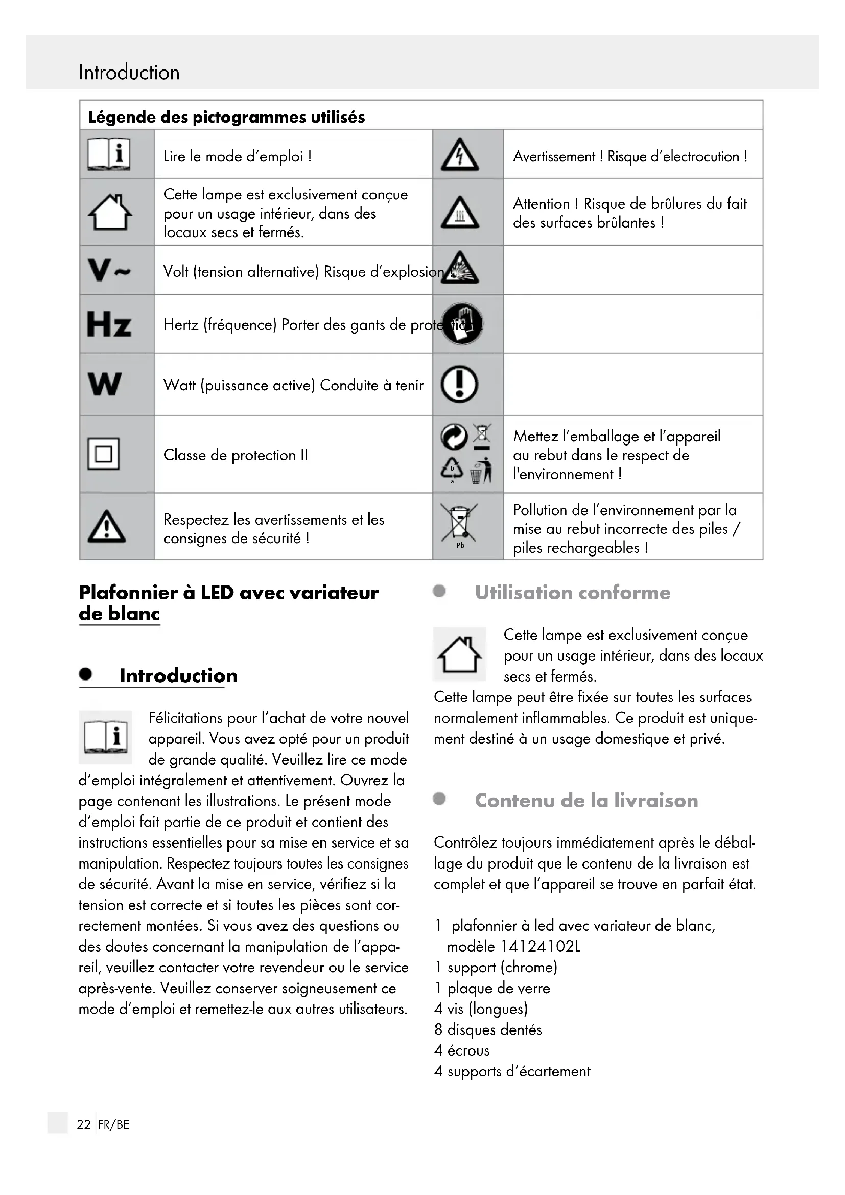 Rondelle (caoutchouc, grande) Caractéristiques techniques Réf. de modèle : 14124102L Tension de service : 230–240 V∼ 50 Hz Ampoules : LEDs (non remplaçables) Puissance nominale : 20 W Classe de protection: II / Degré de protection : IP20 (approprié pour usage à l‘intérieur seulement ) Télécommande : Piles : 2 x 1,5 V AAA Sécurité Indications de sécurité Les droits de recours en garantie sont annulés en cas de dommages résultant du non-respect du présent mode d’emploi ! Le fabricant décline toute respon- sabilité pour les dommages indirects ! De même, toute responsabilité est déclinée pour les dommages matériels ou corporels causés par une manipulation incorrecte ou par le non-respect des consignes de sécurité ! Ne laissez pas la lampe ou le matériel d‘em- ballage traîner sans surveillance. Les films et les sachets en plastique, les éléments en matières synthétiques, etc. peuvent constituer des jouets dangereux pour les enfants. Prévention de risques mortels par électrocution L‘installation électrique doit être effectuée par un électricien ou par une personne dûment formée à cet effet. Avant chaque raccordement au secteur, contrôlez le bon état de la lampe et du câble d‘alimenta- tion. N‘utilisez jamais la lampe si vous constatez le moindre dommage. Des câbles secteur endommagés impliquent un danger de mort par électrocution. En cas d’en- dommagements, de réparations ou d’autres problèmes, veuillez contacter le S.A.V. ou un électricien. Avant le montage, retirez le fusible ou coupez le disjoncteur de la boîte à fusibles (position 0). Avant le montage, vérifiez que la tension secteur corresponde à la tension de service requise de la lampe (voir «Caractéristiques techniques»). Évitez impérativement tout contact de la lampe avec de l‘eau ou d‘autres liquides. N‘ouvrez jamais les composants électriques, et n‘insérez jamais d‘objets quelconques dans ceux-ci. De telles interventions impliquent un danger de mort par électrocution. N‘installez jamais la lampe sur un support humide ou conducteur de courant!24 FR/BE Sécurité Prévention de risque d‘incendies et de blessures RISQUE DE BLESSURES! Immédiatement après le déballage du produit, vérifiez le parfait état de chaque ampoule et verre de lampe. Ne montez pas la lampe avec des ampoules et / ou des verres de lampe défectueux. Si vous constatez des dommages, veuillez contacter le service après-vente pour procéder au remplace- ment de la pièce défectueuse. Ne jamais regarder directement la source lumi- neuse (ampoule, LED, etc.).