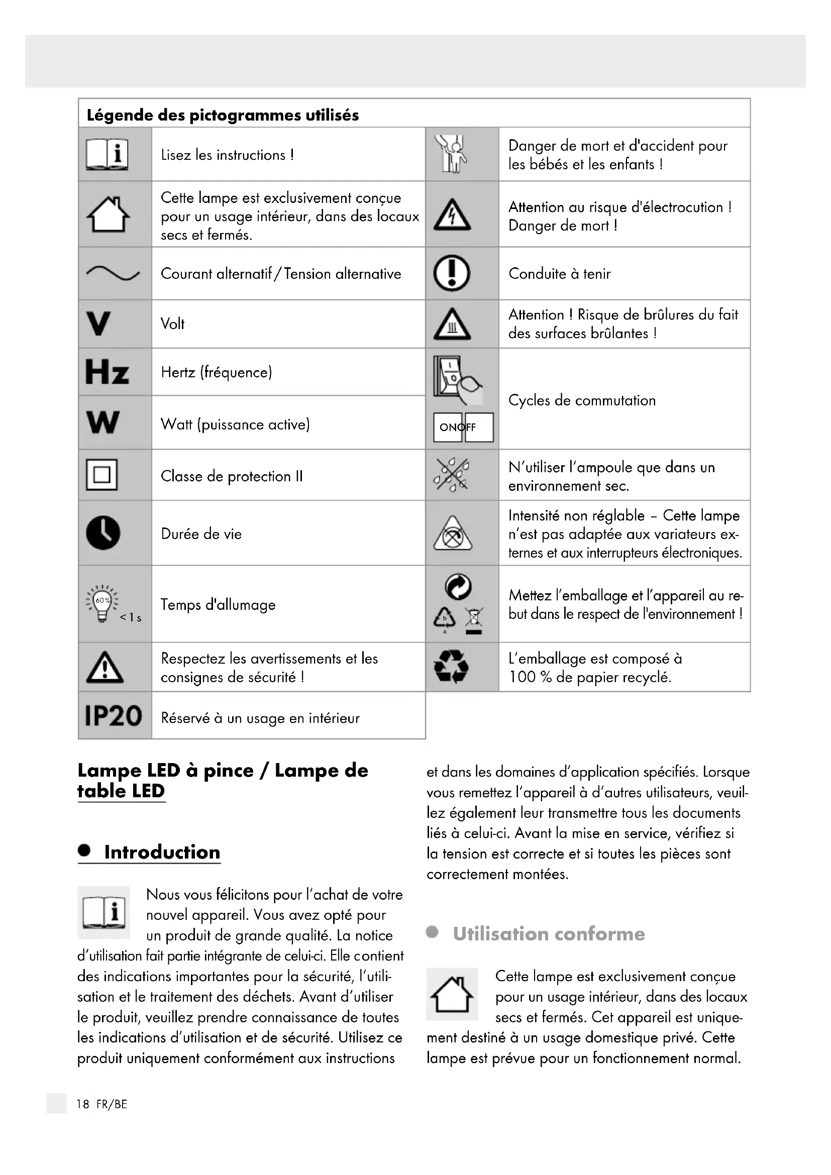 Mettez l’emballage et l’appareil au re- but dans le respect de l'environnement ! Respectez les avertissements et les consignes de sécurité ! L‘emballage est composé à 100 % de papier recyclé. Réservé à un usage en intérieur Lampe LED à pince / Lampe de table LED Introduction Nous vous félicitons pour l‘achat de votre nouvel appareil. Vous avez opté pour un produit de grande qualité. La notice d‘utilisation fait partie intégrante de celui-ci. Elle c ontient des indications importantes pour la sécurité, l‘utili- sation et le traitement des déchets. Avant d‘utiliser le produit, veuillez prendre connaissance de toutes les indications d’utilisation et de sécurité. Utilisez ce produit uniquement conformément aux instructions et dans les domaines d’application spécifiés. Lorsque vous remettez l‘appareil à d‘autres utilisateurs, veuil- lez également leur transmettre tous les documents liés à celui-ci. Avant la mise en service, vérifiez si la tension est correcte et si toutes les pièces sont correctement montées.