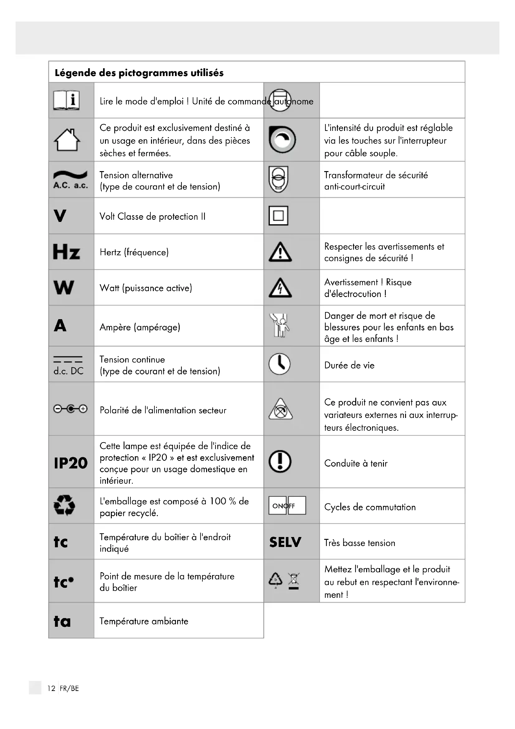 Ampère (ampérage) Danger de mort et risque de blessures pour les enfants en bas âge et les enfants ! d.c. DC Tension continue (type de courant et de tension) Durée de vie Polarité de l'alimentation secteur Ce produit ne convient pas aux variateurs externes ni aux interrup- teurs électroniques. IP20 Cette lampe est équipée de l'indice de protection « IP20 » et est exclusivement conçue pour un usage domestique en intérieur. Conduite à tenir L'emballage est composé à 100 % de papier recyclé. ON OFF Cycles de commutation