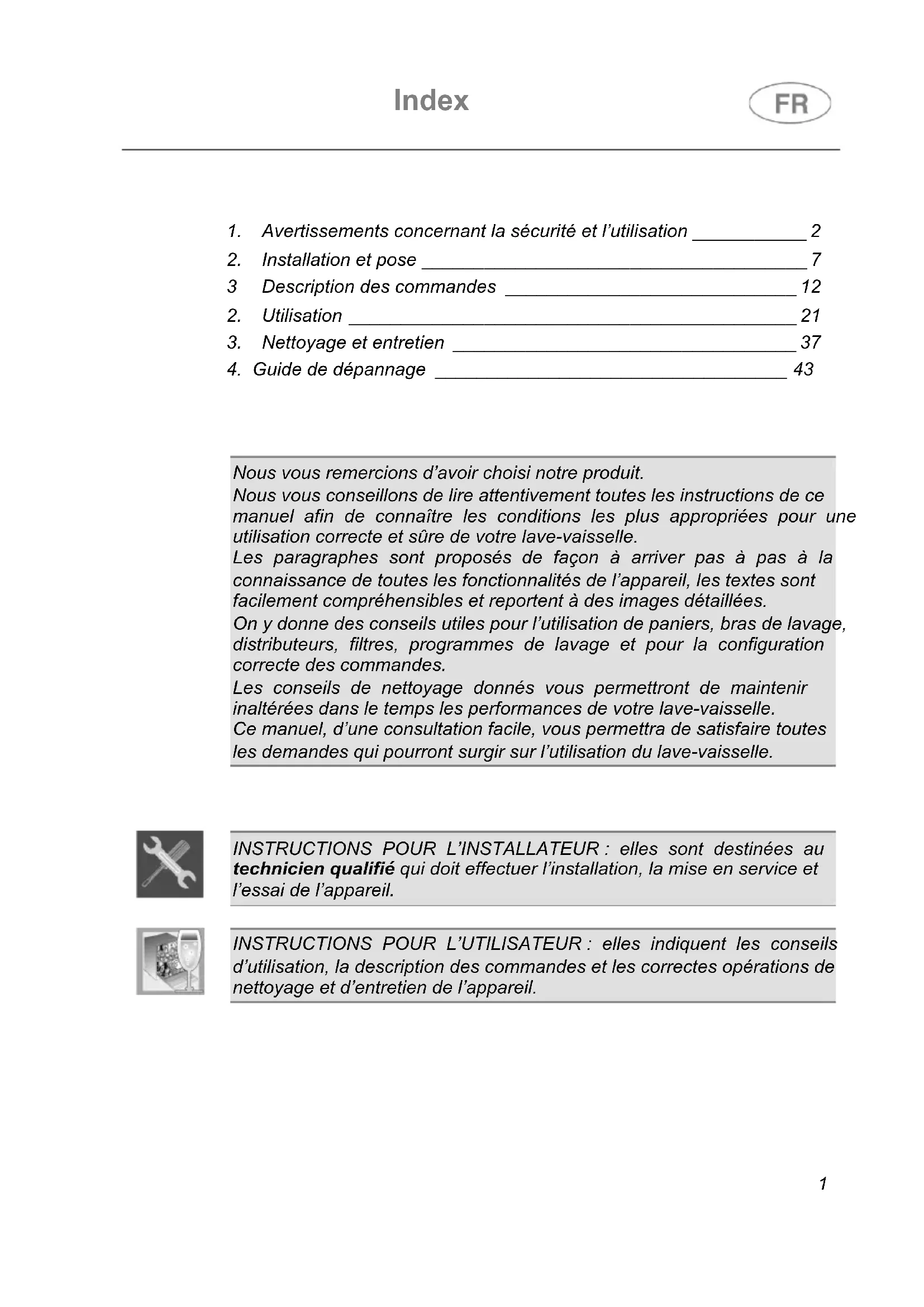 Nous vous remercions d’avoir choisi notre produit. Nous vous conseillons de lire attentivement toutes les instructions de ce manuel afin de connaître les conditions les plus appropriées pour une utilisation correcte et sûre de votre lave-vaisselle. Les paragraphes sont proposés de façon à arriver pas à pas à la connaissance de toutes les fonctionnalités de l’appareil, les textes sont facilement compréhensibles et reportent à des images détaillées. On y donne des conseils utiles pour l’utilisation de paniers, bras de lavage, distributeurs, filtres, programmes de lavage et pour la configuration correcte des commandes. Les conseils de nettoyage donnés vous permettront de maintenir inaltérées dans le temps les performances de votre lave-vaisselle. Ce manuel, d’une consultation facile, vous permettra de satisfaire toutes les demandes qui pourront surgir sur l’utilisation du lave-vaisselle.