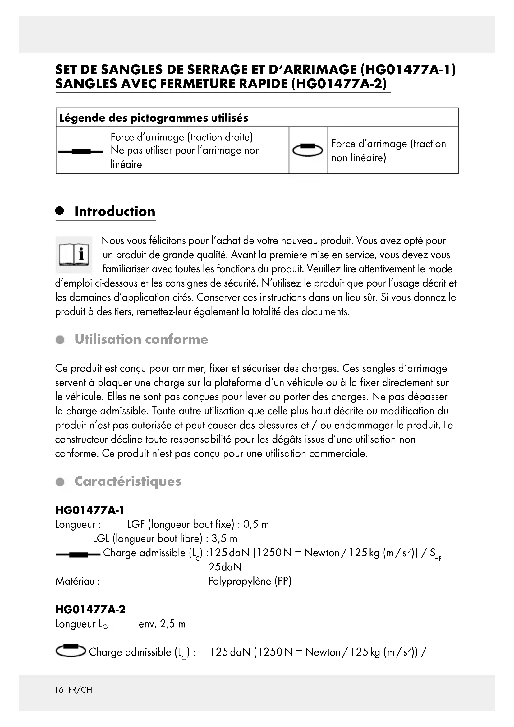 Fourniture Contrôlez immédiatement après le déballage le contenu de livraison en ce qui concerne l‘intégralité du contenu de livraison, ainsi que l‘état irréprochage du produit et de toutes ses pièces. 2 x sangles d’arrimage avec cliquet tendeur et crochet en S, env. 0,5 m (HG01477A-1) 2 x sangles d’arrimage avec crochet en S, env. 3,5 m (HG01477A-1) 2 x sangles d’arrimage avec boucle zamak, env. 2,5 m (HG01477A-2) 1 x mode d’emploi