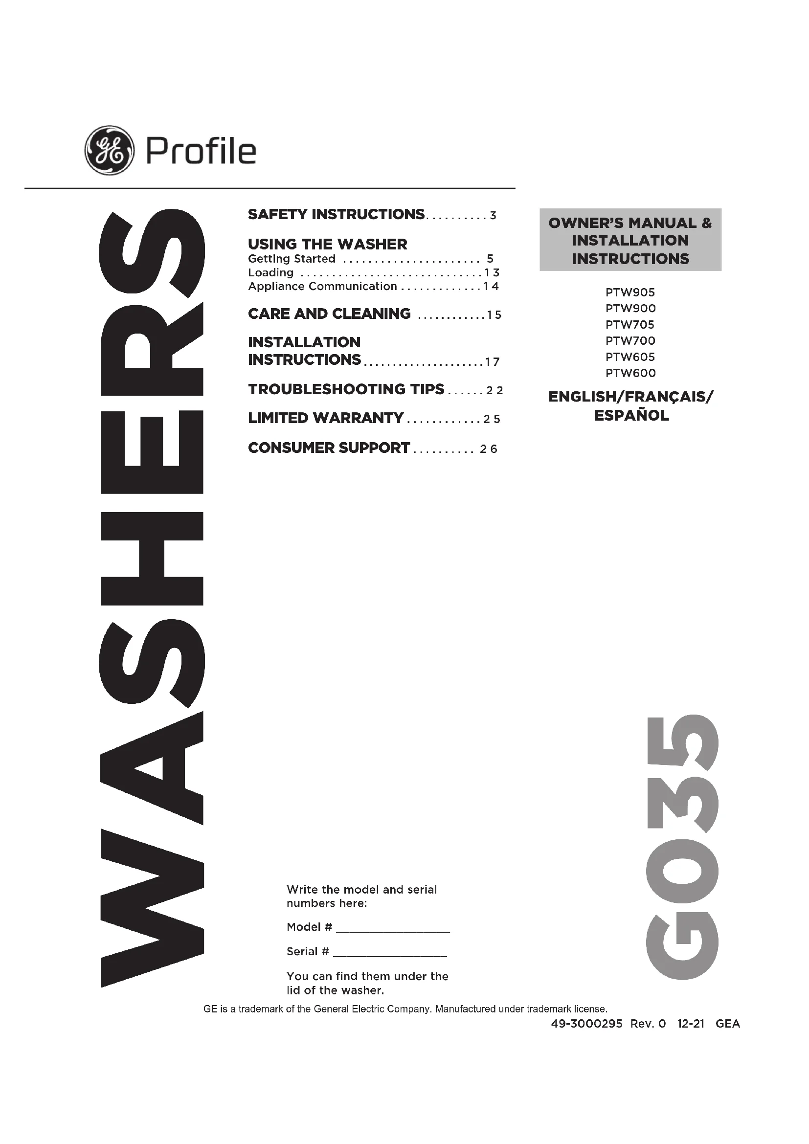 SOUTIEN AU CONSOMMATEUR .............. 28 GE est une marque déposée de General Electric Company. Fabriqué sous licence de marque. PTW905 PTW900 PTW705 PTW700 PTW605 PTW6002 49-3000295 Rev. 0 NOUS VOUS REMERCIONS D’ACCUEILLIR GE APPLIANCES CHEZ VOUS Que vous ayez grandi avec GE Appliances ou qu’il s’agisse de votre première acquisition, nous sommes heureux de vous accueillir dans notre famille. Nous sommes fiers du savoir-faire, de l’innovation et de l’esthétique qui composent chaque appareil GE Appliances, et nous pensons que vous le serez aussi. Dans cette optique, nous vous rappelons que l’enregistrement de votre électroménager vous assure la communication de renseignements importants sur le produit et la garantie lorsque vous en avez besoin. Enregistrez votre électroménager GE en ligne dès maintenant. Des sites Web et des numéros de téléphone utiles figurent dans la section Soutien au consommateur de ce manuel d’utilisation. Vous pouvez aussi poster la fiche de garantie préimprimée incluse dans l’emballage.49-3000295 Rev. 0 3
