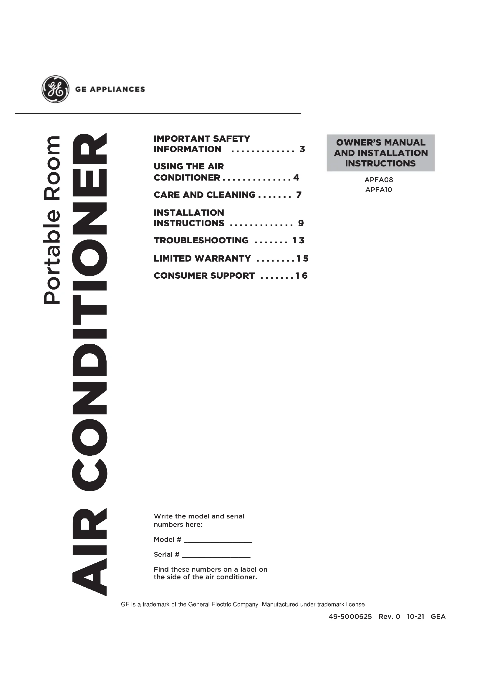 de Série ______________ Vous trouverez ces numéros sur l’étiquette apposée sur le côté du climatiseur. GE est une marque de commerce de General Electric Company. Fabriqué sous licence de marque.2 49-5000625 Rev. 0 NOUS VOUS REMERCIONS D’INTÉGRER GE APPLIANCES À VOTRE DEMEURE Que vous ayez grandi avec des électroménagers GE Appliances ou qu’il s’agisse de votre première acquisition, nous sommes heureux de vous accueillir dans notre famille. Nous sommes fiers du savoir-faire, de l’innovation et du design qui constituent chaque électroménager GE, et nous pensons que vous le serez aussi. Nous vous rappelons que l’enregistrement de votre électroménager vous assure de recevoir des renseignements importants sur le produit et la garantie lorsque vous en avez besoin. Enregistrez votre électroménager GE en ligne dès maintenant. Des sites Web et des numéros de téléphone utiles figurent dans la section Soutien au consommateur de ce manuel d’utilisation. Vous pouvez également envoyer par courrier la carte d’enregistrement pré-imprimée qui se trouve dans l’emballage de votre appareil.49-5000625 Rev. 0 3