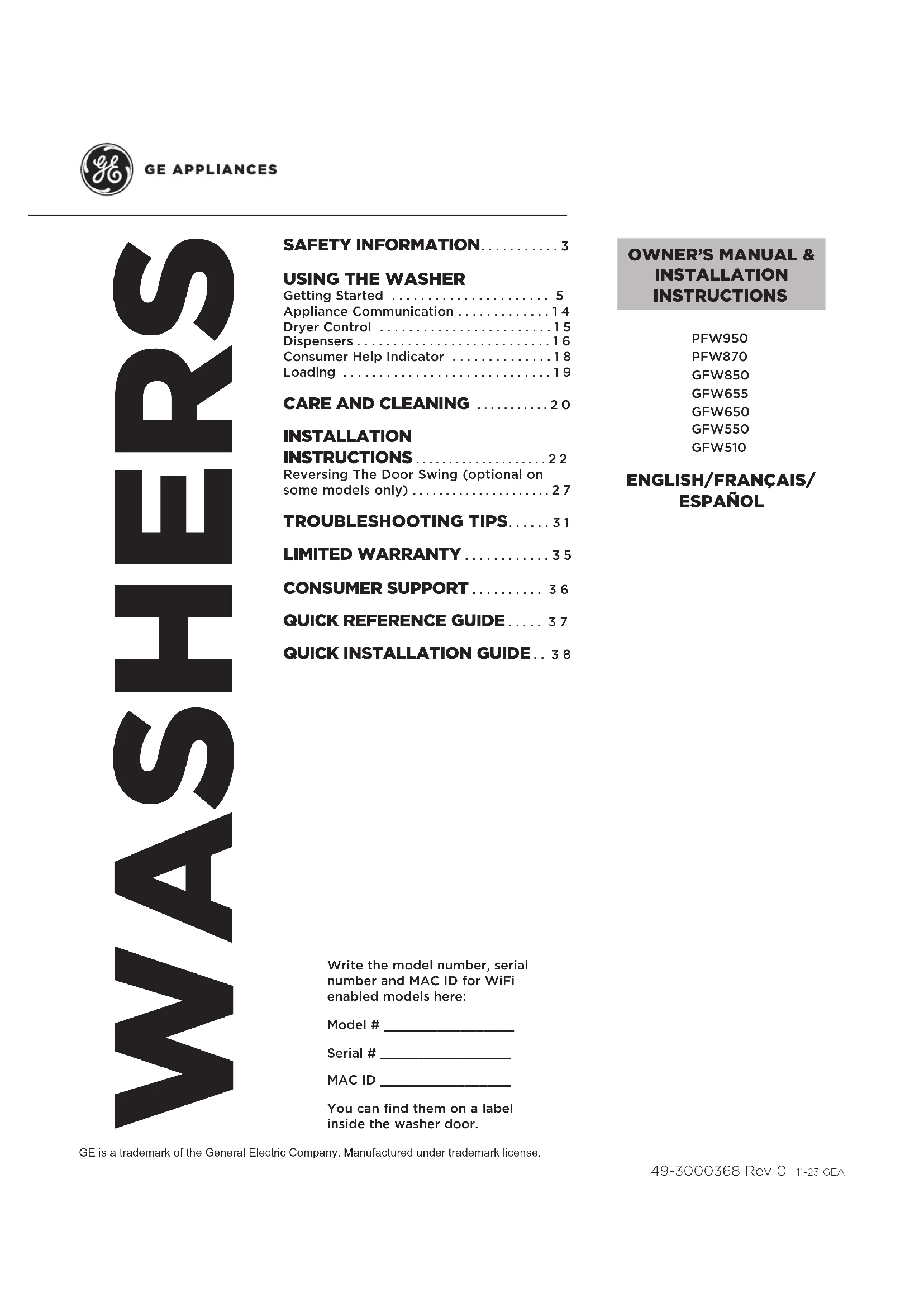 RAPIDE .......................... 38 GE est une marque déposée de General Electric Company. Fabriqué sous licence de marque. Inscrivez vos numéro de modèle et de série et votre identifiant MAC pour les modèles Wi-Fi ici : Modèle # ________________ Modèle # ________________ MAC ID _________________ Vous les trouverez sur une étiquette placée à intérieur de la porte. 49-3000368 Rev 0 11-23 GEA FRANÇAIS PFW950 PFW870 GFW850 GFW655 GFW650 GFW550 GFW5102 49-3000368 Rev 0 NOUS VOUS REMERCIONS D’ACCUEILLIR GE APPLIANCES CHEZ VOUS Que vous ayez grandi avec GE Appliances ou qu’il s’agisse de votre première acquisition, nous sommes heureux de vous accueillir dans notre famille. Nous sommes fiers du savoir-faire, de l’innovation et de l’esthétique qui composent chaque appareil GE Appliances, et nous pensons que vous le serez aussi. Dans cette optique, nous vous rappelons que l’enregistrement de votre électroménager vous assure la communication de renseignements importants sur le produit et la garantie lorsque vous en avez besoin. Enregistrez votre électroménager GE en ligne dès maintenant. Des sites Web et des numéros de téléphone utiles figurent dans la section Soutien au consommateur de ce manuel d’utilisation. Vous pouvez aussi poster la fiche de garantie préimprimée incluse dans l’emballage.49-3000368 Rev 0 3 LIRE ET