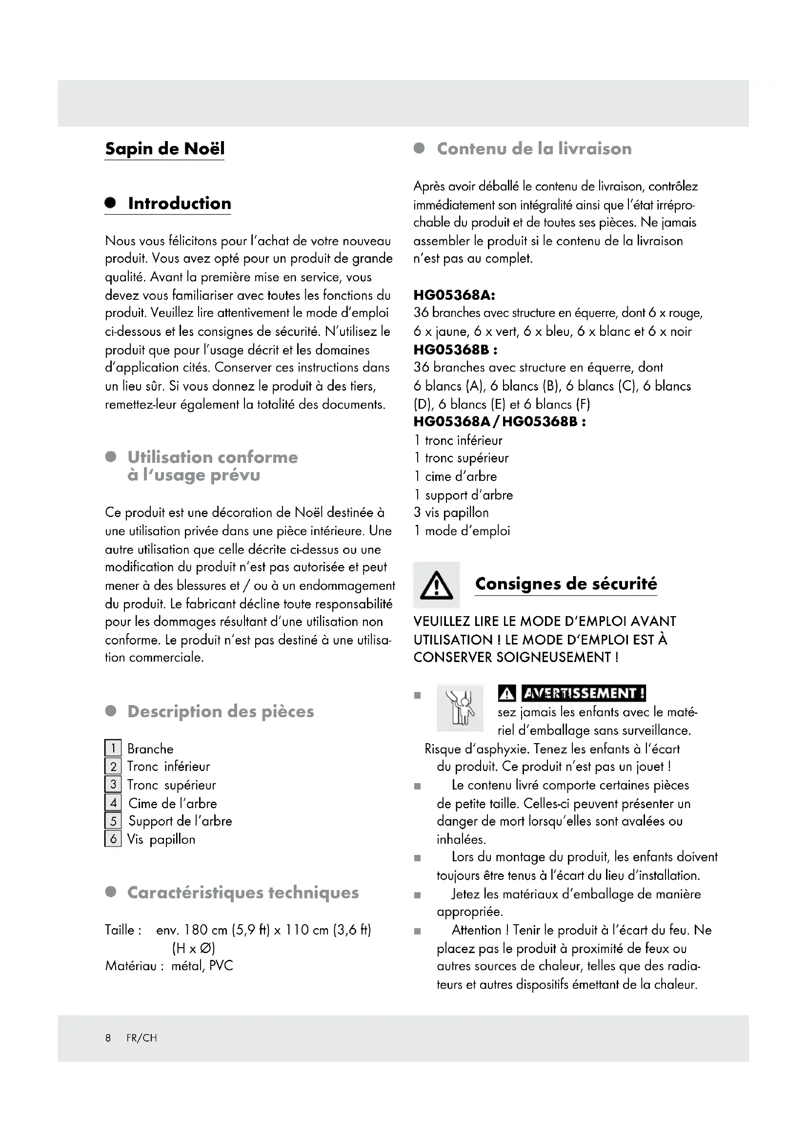 Contenu de la livraison Après avoir déballé le contenu de livraison, contrôlez immédiatement son intégralité ainsi que l‘état irrépro- chable du produit et de toutes ses pièces. Ne jamais assembler le produit si le contenu de la livraison n‘est pas au complet. HG05368A: 36 branches avec structure en équerre, dont 6 x rouge, 6 x jaune, 6 x vert, 6 x bleu, 6 x blanc et 6 x noir HG05368B : 36 branches avec structure en équerre, dont 6 blancs (A), 6 blancs (B), 6 blancs (C), 6 blancs (D), 6 blancs (E) et 6 blancs (F) HG05368A / HG05368B : 1 tronc inférieur 1 tronc supérieur 1 cime d‘arbre 1 support d‘arbre 3 vis papillon 1 mode d‘emploi Consignes de sécurité VEUILLEZ LIRE LE MODE D‘EMPLOI AVANT