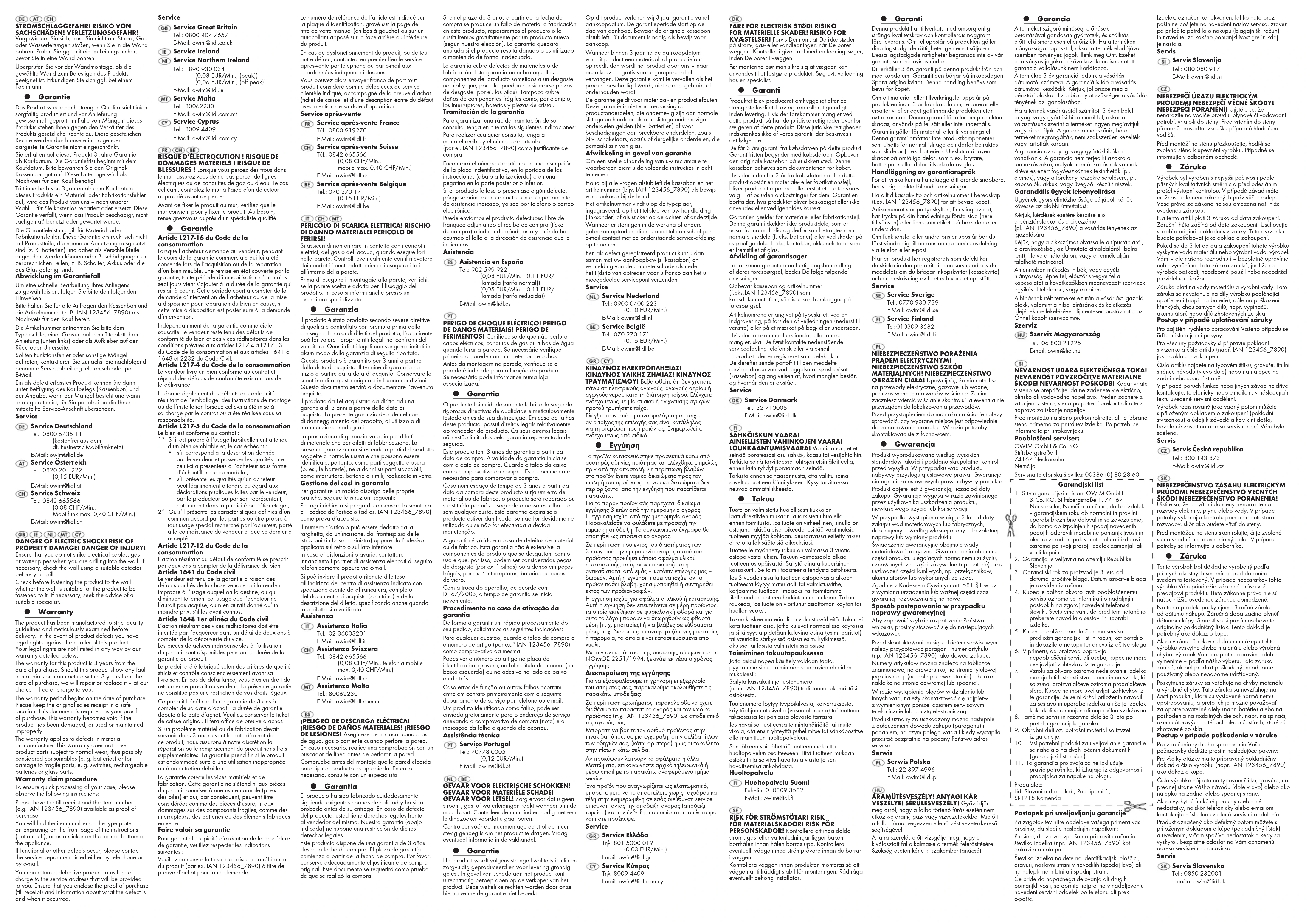 - s‘il présente les qualités qu‘un acheteur peut légitimement attendre eu égard aux déclarations publiques faites par le vendeur, par le producteur ou par son représentant, notamment dans la publicité ou l‘étiquetage ; 2° Ou s‘il présente les caractéristiques définies d‘un commun accord par les parties ou être propre à tout usage spécial recherché par l‘acheteur, porté à la connaissance du vendeur et que ce dernier a accepté. Article L217‑12 du Code de la consommation L‘action résultant du défaut de conformité se prescrit par deux ans à compter de la délivrance du bien. Article 1641 du Code civil Le vendeur est tenu de la garantie à raison des défauts cachés de la chose vendue qui la rendent impropre à l‘usage auquel on la destine, ou qui diminuent tellement cet usage que l‘acheteur ne l‘aurait pas acquise, ou n‘en aurait donné qu‘un moindre prix, s‘il les avait connus. Article 1648 1er alinéa du Code civil L‘action résultant des vices rédhibitoires doit être intentée par l‘acquéreur dans un délai de deux ans à compter de la découverte du vice. Les pièces détachées indispensables à l’utilisation du produit sont disponibles pendant la durée de la garantie du produit. Le produit a été fabriqué selon des critères de qualité stricts et contrôlé consciencieusement avant sa livraison. En cas de défaillance, vous êtes en droit de retourner ce produit au vendeur. La présente garantie ne constitue pas une restriction de vos droits légaux. Ce produit bénéficie d‘une garantie de 3 ans à compter de sa date d’achat. La durée de garantie débute à la date d’achat. Veuillez conserver le ticket de caisse original. Il fera office de preuve d’achat. Si un problème matériel ou de fabrication devait survenir dans 3 ans suivant la date d‘achat de ce produit, nous assurons à notre discrétion la réparation ou le remplacement du produit sans frais supplémentaires. La garantie prend fin si le produit est endommagé suite à une utilisation inappropriée ou à un entretien défaillant. La garantie couvre les vices matériels et de fabrication. Cette garantie ne s’étend ni aux pièces du produit soumises à une usure normale (p. ex. des piles) et qui, par conséquent, peuvent être considérées comme des pièces d’usure, ni aux dommages sur des composants fragiles, comme des interrupteurs, des batteries ou des éléments fabriqués en verre. Faire valoir sa garantie Pour garantir la rapidité d’exécution de la procédure de garantie, veuillez respecter les indications suivantes : Veuillez conserver le ticket de caisse et la référence du produit (par ex. IAN 123456_7890) à titre de preuve d’achat pour toute demande. Le numéro de référence de l’article est indiqué sur la plaque d’identification, gravé sur la page de titre de votre manuel (en bas à gauche) ou sur un autocollant apposé sur la face arrière ou inférieure du produit. En cas de dysfonctionnement du produit, ou de tout autre défaut, contactez en premier lieu le service après-vente par téléphone ou par e-mail aux coordonnées indiquées ci-dessous. Vous pouvez alors envoyer franco de port tout produit considéré comme défectueux au service clientèle indiqué, accompagné de la preuve d’achat (ticket de caisse) et d’une description écrite du défaut avec mention de sa date d’apparition. Service après‑vente Service après‑vente France Tél.: 0800 919270 E-Mail: owim@lidl.fr Service après‑vente Suisse Tél.: 0842 665566 (0,08 CHF/Min., mobile max. 0,40 CHF/Min.) E-Mail: owim@lidl.ch Service après‑vente Belgique Tél.: 070 270 171 (0,15 EUR/Min.) E-Mail: owim@lidl.be