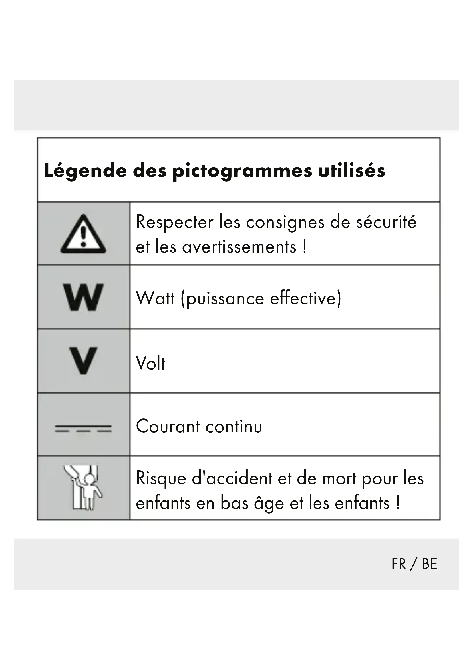 LES ENFANTS ! Ne laissez jamais les enfants sans surveillance avec le matériel d’embal- lage. Il y a risque d’asphyxie. Tenez les enfants éloignés du produit. Cet appareil peut être utilisé par des enfants d’au moins 8 ans et par des personnes dispo- sant de capacités physiques, sensorielles ou mentales réduites ou de peu d’expérience et/ ou de connaissances, à condition qu’ils soient surveillés ou qu’ils aient été initiés à l’utilisation FR / BEsécurisée de l’appareil et qu’ils aient compris les dangers en résultant. Les enfants ne doivent pas jouer avec le produit. Nettoyage et entretien utilisateur ne doivent pas être réalisés par des enfants sans surveil- lance. N’utilisez pas le produit si vous constatez quelque dommage que ce soit. N’exposez jamais le produit à des tempéra- tures et à une humidité importantes, sans quoi le produit risque d’être endommagé. Prévenez toute sollicitation mécanique du produit ! Adressez-vous à un électricien spécialisé en cas de détériorations, réparations ou d’autres problèmes. FR / BEPRUDENCE ! RISQUE DE SURCHAUFFE ! N’utilisez pas l’appareil dans l’emballage. Conservez le produit dans son emballage après utilisation afin d’éviter toute détériora- tion involontaire. Ce produit ne comporte pas de pièces que le consommateur peut entretenir. Les LED ne sont pas remplaçables. Si les LED viennent à tomber en panne en fin de vie, le produit entier doit être remplacé. Le produit ne doit pas être branché électrique- ment à un autre produit. Ne branchez jamais le produit directement à une prise de 230 V. FR / BE Le produit est exclusivement adapté à une utilisation en intérieure, dans des locaux secs et fermés. Consignes de sécurité pour les piles / batteries DANGER DE MORT ! Tenez les piles / batte- ries hors de portée des enfants. Consultez immé- diatement un médecin en cas d’avalement ! RISQUE D’EXPLOSION ! Ne rechargez jamais des piles qui ne sont pas rechargeables. Ne court-circuitez pas les piles / batteries et /ou ne les ouvrez pas. Surchauffe, risque d’incen- die ou explosion peuvent s’ensuivre. FR / BE Ne jetez jamais les piles / batteries au feu ou à l’eau. N’exposez pas les piles / batteries à des sollicitations mécaniques. Risque de fuite des piles / batteries Évitez les conditions et températures extrêmes qui risquent d’agir sur les piles / batteries par ex. les radiateurs / le rayonnement direct du soleil. Si les piles / batteries ont coulé, évitez tout contact des produits chimiques avec la peau, les yeux et les muqueuses ! Rincez immédia- tement les endroits concernés à l’eau claire et consultez un médecin !