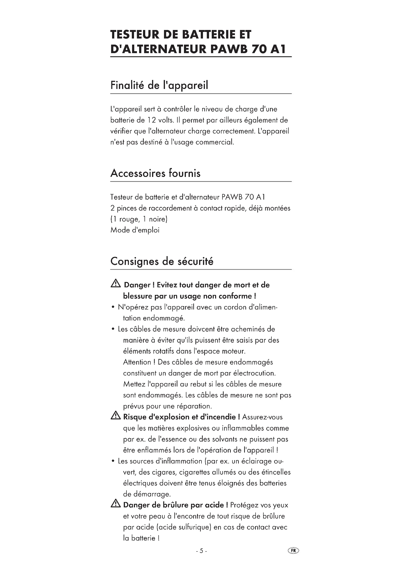 Finalité de l'appareil L'appareil sert à contrôler le niveau de charge d'une batterie de 12 volts. Il permet par ailleurs également de vérifier que l'alternateur charge correctement. L'appareil n'est pas destiné à l'usage commercial. Accessoires fournis Testeur de batterie et d'alternateur PAWB 70 A1 2 pinces de raccordement à contact rapide, déjà montées (1 rouge, 1 noire) Mode d'emploi Consignes de sécurité Danger ! Evitez tout danger de mort et de blessure par un usage non conforme !