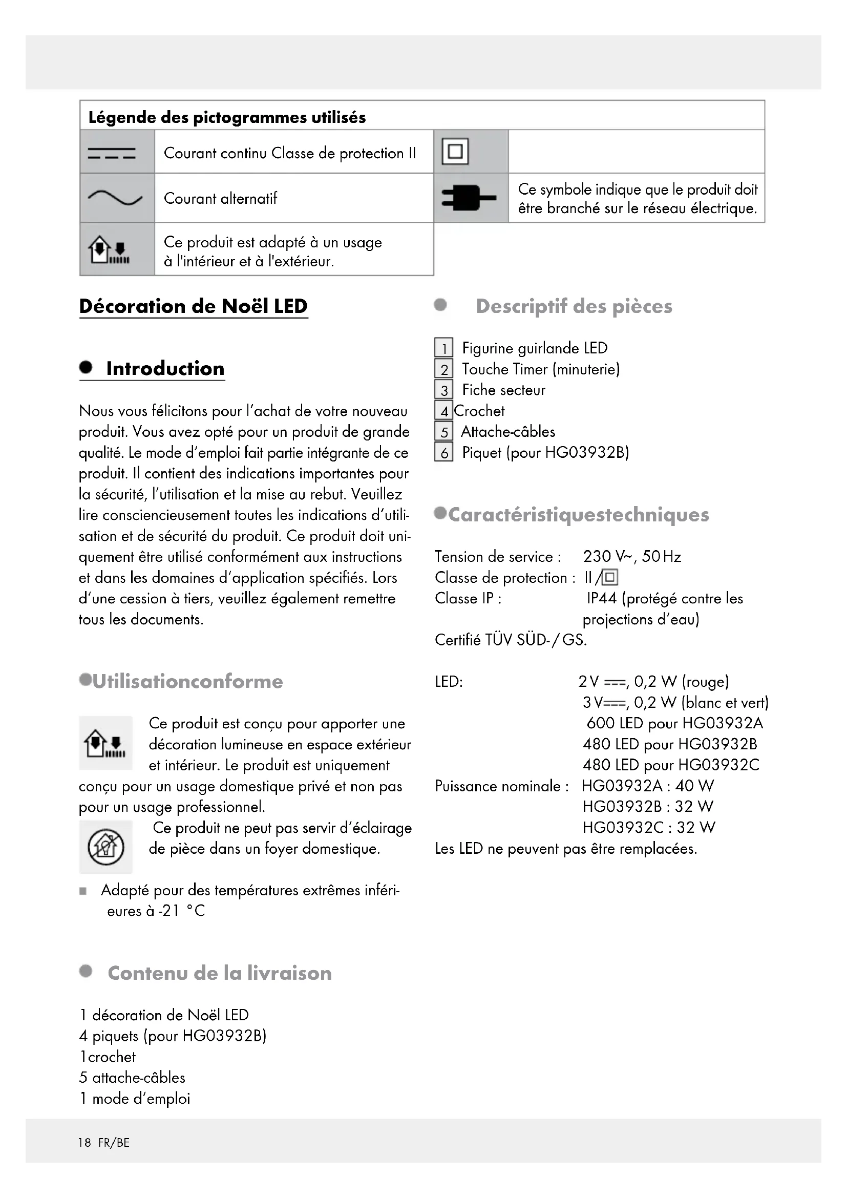 The warranty applies to defects in material or manu- facture. This warranty does not cover product parts subject to normal wear, thus possibly considered consumables (e.g. batteries) or for damage to fra- gile parts, e.g. switches, rechargeable batteries or glass parts.17 FR/BE Légende des pictogrammes utilisés .......................................................................... Page 18 Introduction ................................................................................................................................... Page 18 Utilisation conforme ............................................................................................................................Page 18 Contenu de la livraison .......................................................................................................................Page 18 Descriptif des pièces ...........................................................................................................................Page 18 Caractéristiques techniques ................................................................................................................Page 18 Consignes de sécurité ...........................................................................................................Page 19 Avant la mise en service .....................................................................................................Page 21 Montage ...........................................................................................................................................Page 21 Utilisation ........................................................................................................................................Page 21 Fonction minuterie ................................................................................................................... Page 21 Nettoyage et entretien ........................................................................................................ Page 21 Mise au rebut ............................................................................................................................... Page 22 Garantie ........................................................................................................................................... Page 2218 FR/BE Légende des pictogrammes utilisés Courant continu Classe de protection II Courant alternatif Ce symbole indique que le produit doit être branché sur le réseau électrique. Ce produit est adapté à un usage à l'intérieur et à l'extérieur. Décoration de Noël LED Introduction Nous vous félicitons pour l‘achat de votre nouveau produit. Vous avez opté pour un produit de grande qualité. Le mode d‘emploi fait partie intégrante de ce produit. Il contient des indications importantes pour la sécurité, l’utilisation et la mise au rebut. Veuillez lire consciencieusement toutes les indications d‘utili- sation et de sécurité du produit. Ce produit doit uni- quement être utilisé conformément aux instructions et dans les domaines d‘application spécifiés. Lors d‘une cession à tiers, veuillez également remettre tous les documents. Utilisation conforme Ce produit est conçu pour apporter une décoration lumineuse en espace extérieur et intérieur. Le produit est uniquement conçu pour un usage domestique privé et non pas pour un usage professionnel. Ce produit ne peut pas servir d‘éclairage de pièce dans un foyer domestique. Adapté pour des températures extrêmes inféri- eures à -21 °C Contenu de la livraison 1 décoration de Noël LED 4 piquets (pour HG03932B) 1 crochet 5 attache-câbles 1 mode d‘emploi Descriptif des pièces