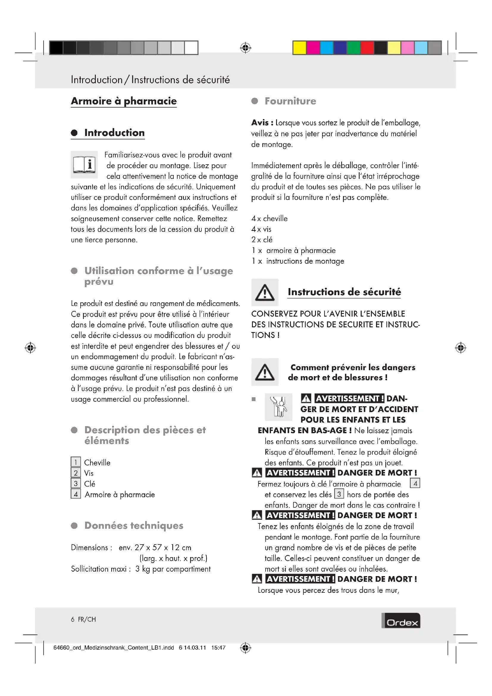 hors de portée des enfants. Danger de mort dans le cas contraire! AVERTISSEMENT ! DANGER DE MORT! Tenez les enfants éloignés de la zone de travail pendant le montage. Font partie de la fourniture un grand nombre de vis et de pièces de petite taille. Celles-ci peuvent constituer un danger de mort si elles sont avalées ou inhalées. AVERTISSEMENT ! DANGER DE MORT! Lorsque vous percez des trous dans le mur, 64660_ord_Medizinschrank_Content_LB1.indd 6 14.03.11 15:477 FR/CH Instructions de sécurité / Montage / Nettoyage et entretien assurez-vous de ne pas percer de lignes élec- triques, conduites de gaz et d’eau. Le cas échéant, contrôlez le mur avec un détecteur de conduites et lignes électriques avant de percer. m ATTENTION! RISQUE DE BLESSURES! Assurez-vous que l’ensemble des pièces ne sont pas endommagées et sont montées cor- rectement. Il y a risque de blessure en cas de montage incorrect. Des pièces endommagées peuvent avoir une incidence sur la sécurité et le fonctionnement. m ATTENTION! Ne laissez pas les enfants sans surveillance! Ce produit n’est ni un jouet ni une structure de jeu à grimper! Veillez à ce que personne, en particulier des enfants, ne se mette sur le produit ou ne l’utilise en s’y accro- chant pour se lever. Il peut en résulter des bles- sures et / ou endommagements. J Veillez à ce que le produit ne soit monté que par des personnes compétentes. J Avant d’utiliser le produit, contrôlez-en la stabilité.