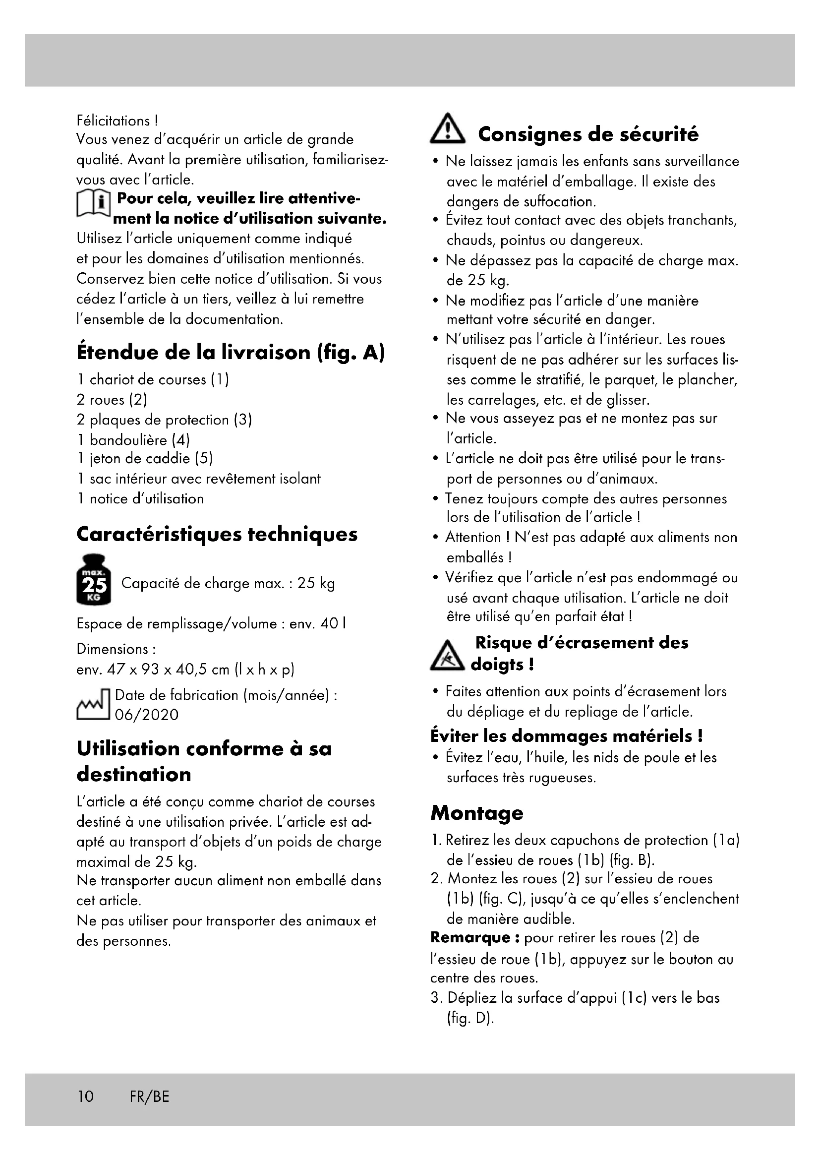 Capacité de charge max. : 25 kg Espace de remplissage/volume : env. 40 l Dimensions : env. 47 x 93 x 40,5 cm (l x h x p) Date de fabrication (mois/année) : 06/2020 Utilisation conforme à sa destination L’article a été conçu comme chariot de courses destiné à une utilisation privée. L’article est ad- apté au transport d’objets d’un poids de charge maximal de 25 kg. Ne transporter aucun aliment non emballé dans cet article. Ne pas utiliser pour transporter des animaux et des personnes. Consignes de sécurité