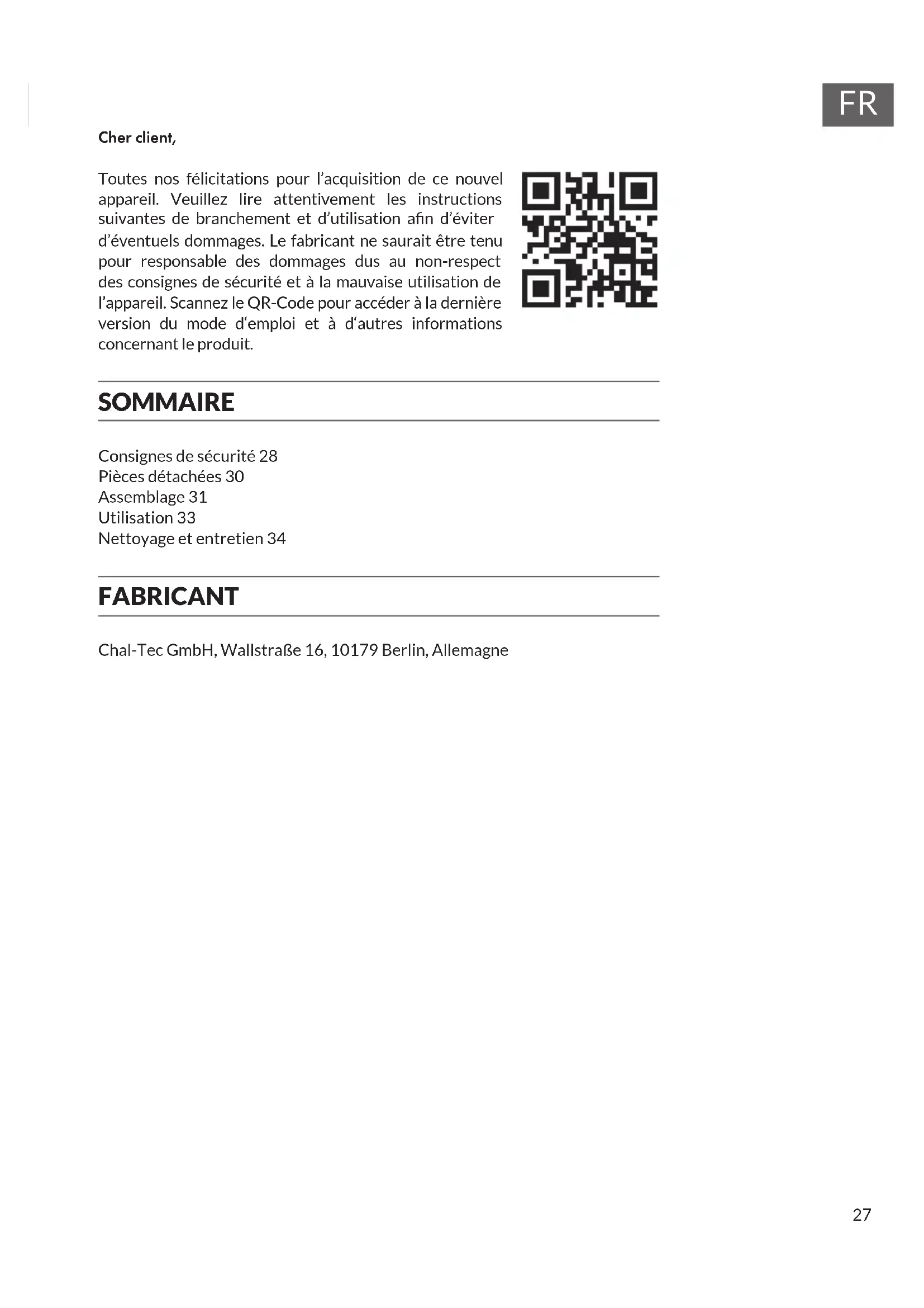 Cher client, Toutes nos félicitations pour l’acquisition de ce nouvel appareil. Veuillez lire attentivement les instructions suivantes de branchement et d’utilisation an d’éviter d’éventuels dommages. Le fabricant ne saurait être tenu pour responsable des dommages dus au non-respect des consignes de sécurité et à la mauvaise utilisation de l’appareil. Scannez le QR-Code pour accéder à la dernière version du mode d‘emploi et à d‘autres informations concernant le produit. SOMMAIRE Consignes de sécurité 28 Pièces détachées 30 Assemblage 31 Utilisation 33 Nettoyage et entretien 34 FABRICANT Chal-Tec GmbH, Wallstraße 16, 10179 Berlin, Allemagne28