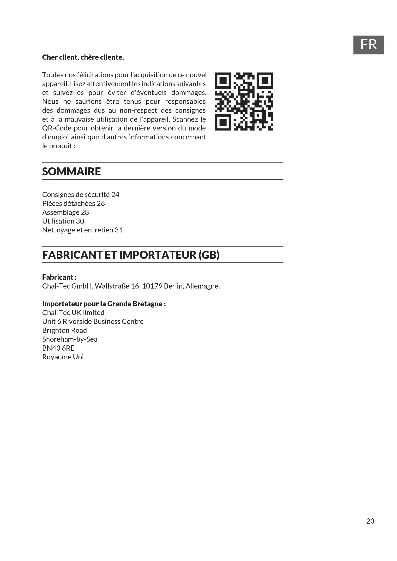 Toutes nos félicitations pour l'acquisition de ce nouvel apparéil. Lisez attentivement les indications suivantes et suivez-les pour éviter d'eventuels dommages. Nous ne saurions être tenus pour responsables des dommages dus au non-respect des consignes et à la mauvaise'utilisation de l' apparéil. Scannez le QR-Code pour obtenir la première version du mode d'emploi ainsi que d'autres informations concernant le produit: