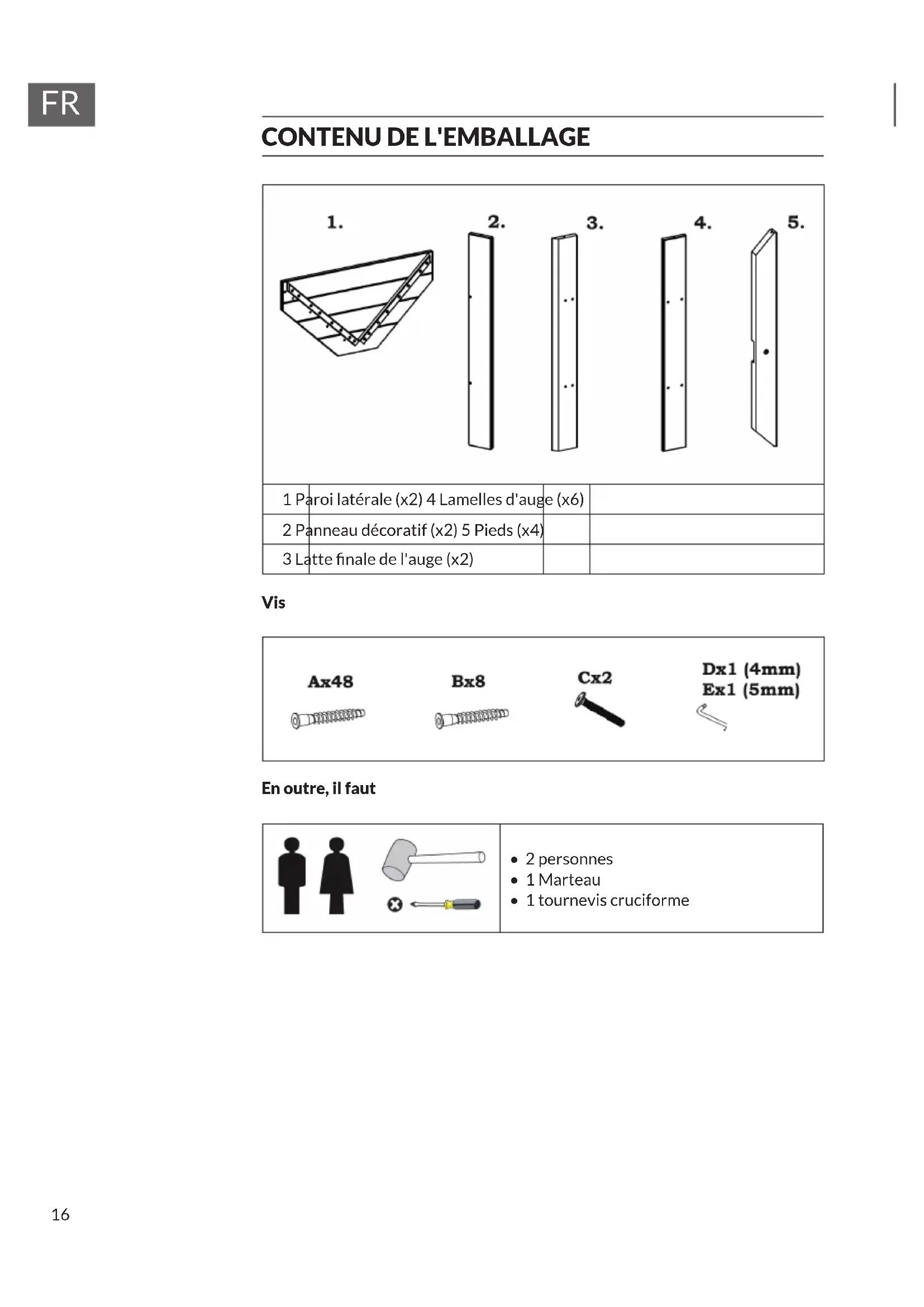 1 Paroi latérale (x2) 4 Lamelles d'auge (x6) 2 Panneau décoratif (x2) 5 Pieds (x4) 3 Latte nale de l'auge (x2) Vis En outre, il faut