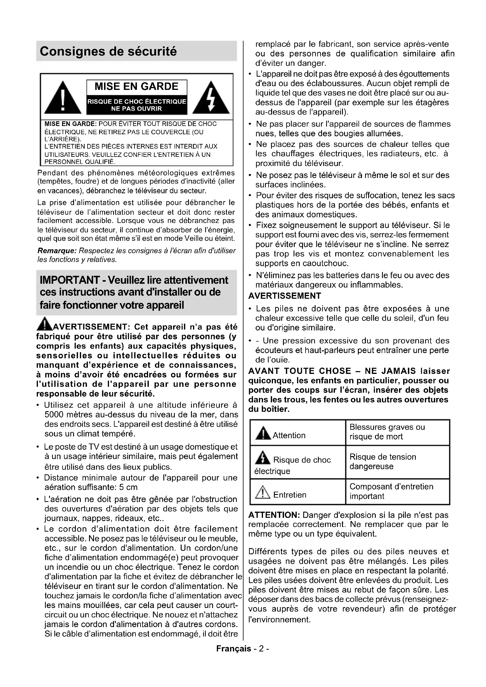 Important - veuillez prêter attention à ces instructions avant d'installer ou de faire fonctionner votre appareil
