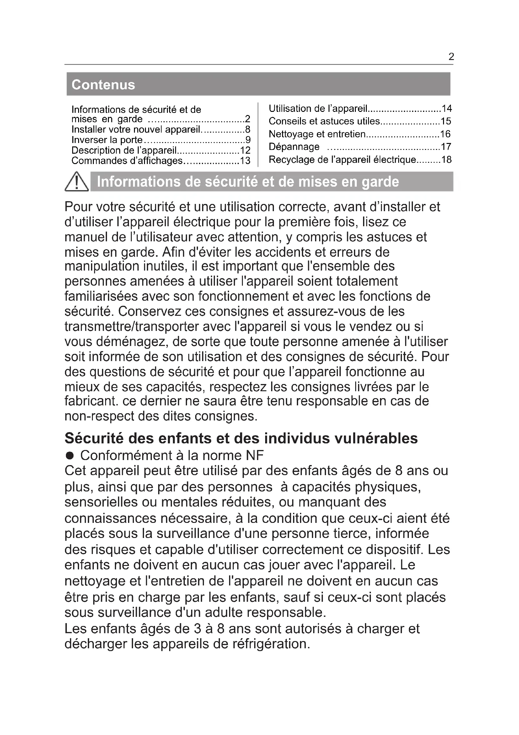 Conformément à la norme NF Cet appareil peut être utilisé par des enfants âgés de 8 ans ou plus, ainsi que par des personnes à capacités physiques, sensorielles ou mentales réduites, ou manquant des connaissances nécessaire, à la condition que ceux-ci aient été placés sous la surveillance d'une personne tierce, informée des risques et capable d'utiliser correctement ce dispositif. Les enfants ne doivent en aucun cas jouer avec l'appareil. Le nettoyage et l'entretien de l'appareil ne doivent en aucun cas être pris en charge par les enfants, sauf si ceux-ci sont placés sous surveillance d'un adulte responsable. Les enfants âgés de 3 à 8 ans sont autorisés à charger et décharger les appareils de réfrigération. Contenus Informations de sécurité et de mises en garde …................................2 Installer votre nouvel appareil.