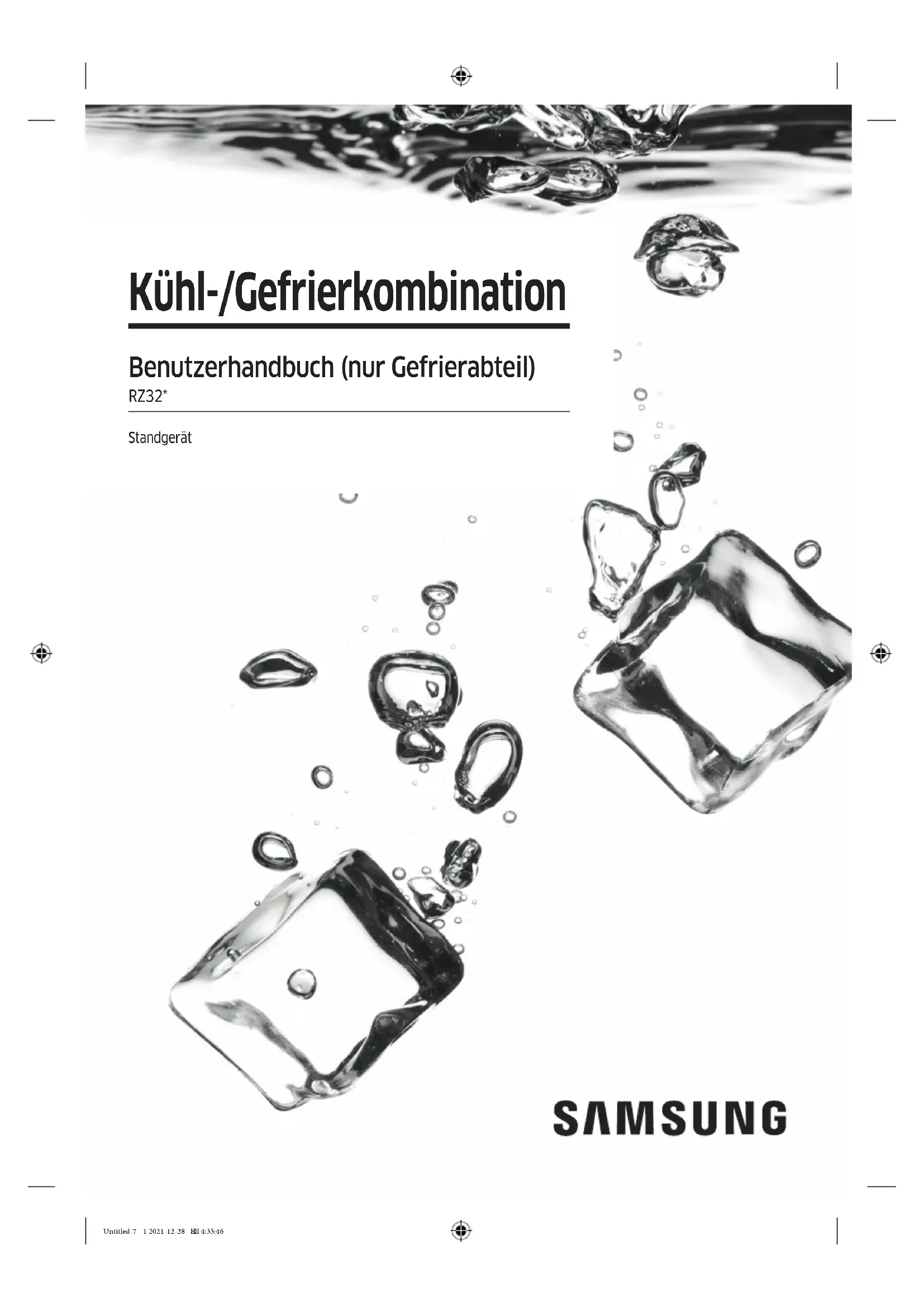 www.samsung.com/be/support (Dutch) www.samsung.com/be_fr/support (French) DA68-03561D-06 Untitled-8 72 2021-12-28 4:39:32Réfrigérateur Manuel d'utilisation (congélateur uniquement) RZ32* Appareil non encastrable Untitled-9 1 2021-12-28 4:58:02Français2 Sommaire Sommaire Consignes de sécurité 3 Consignes de sécurité importantes et symboles : 6 Symboles d'avertissement importants concernant le transport et le lieu d'installation de l'appareil 7 Avertissements importants concernant l'installation 7 Installation en toute sécurité 12 Avertissements importants concernant l'utilisation 12 Avertissement relatif à l'utilisation 18 Utilisation en toute sécurité 19 Nettoyage en toute sécurité 21 Avertissements importants concernant la mise au rebut 22 Conseils complémentaires pour une utilisation appropriée 24 Conseils en matière d'économie d'énergie 25 Cet appareil est destiné à être utilisé dans les applications domestiques et similaires telles que : 26 Instructions concernant la règlementation DEEE 27 Installation 28 Présentation rapide du réfrigérateur 28 Installation étape par étape 29 Opérations 34 Panneau de commande 34 Fonctions spéciales 36 Entretien 41 Inversion de la porte (modèles applicables uniquement) 41 Utilisation et entretien 58 Nettoyage 61 Remplacement 61 Dépannage 62 Généralités 62 Entendez-vous des sons anormaux provenant du réfrigérateur ? 64