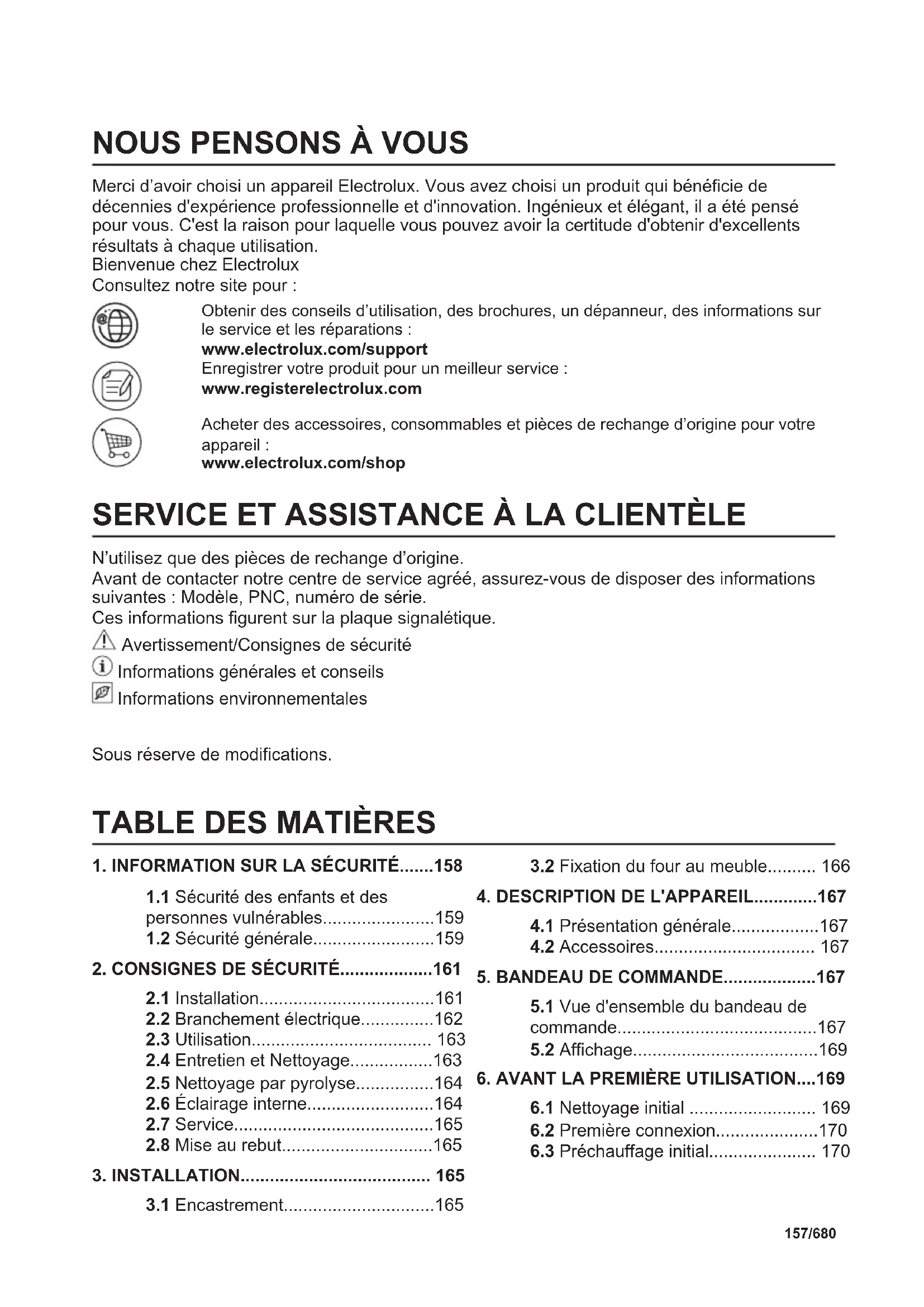 Merci d’avoir choisi un appareil Electrolux. Vous avez choisi un produit qui bénéficie de décennies d'expérience professionnelle et d'innovation. Ingénieux et élégant, il a été pensé pour vous. C'est la raison pour laquelle vous pouvez avoir la certitude d'obtenir d'excellents résultats à chaque utilisation. Bienvenue chez Electrolux Consultez notre site pour : Obtenir des conseils d’utilisation, des brochures, un dépanneur, des informations sur le service et les réparations : www.electrolux.com/support Enregistrer votre produit pour un meilleur service : www.registerelectrolux.com Acheter des accessoires, consommables et pièces de rechange d’origine pour votre appareil : www.electrolux.com/shop