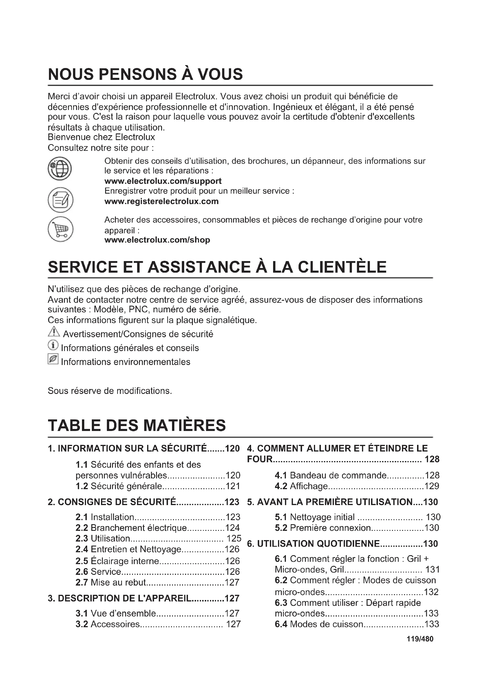 Merci d’avoir choisi un appareil Electrolux. Vous avez choisi un produit qui bénéficie de décennies d'expérience professionnelle et d'innovation. Ingénieux et élégant, il a été pensé pour vous. C'est la raison pour laquelle vous pouvez avoir la certitude d'obtenir d'excellents résultats à chaque utilisation. Bienvenue chez Electrolux Consultez notre site pour : Obtenir des conseils d’utilisation, des brochures, un dépanneur, des informations sur le service et les réparations : www.electrolux.com/support Enregistrer votre produit pour un meilleur service : www.registerelectrolux.com Acheter des accessoires, consommables et pièces de rechange d’origine pour votre appareil : www.electrolux.com/shop