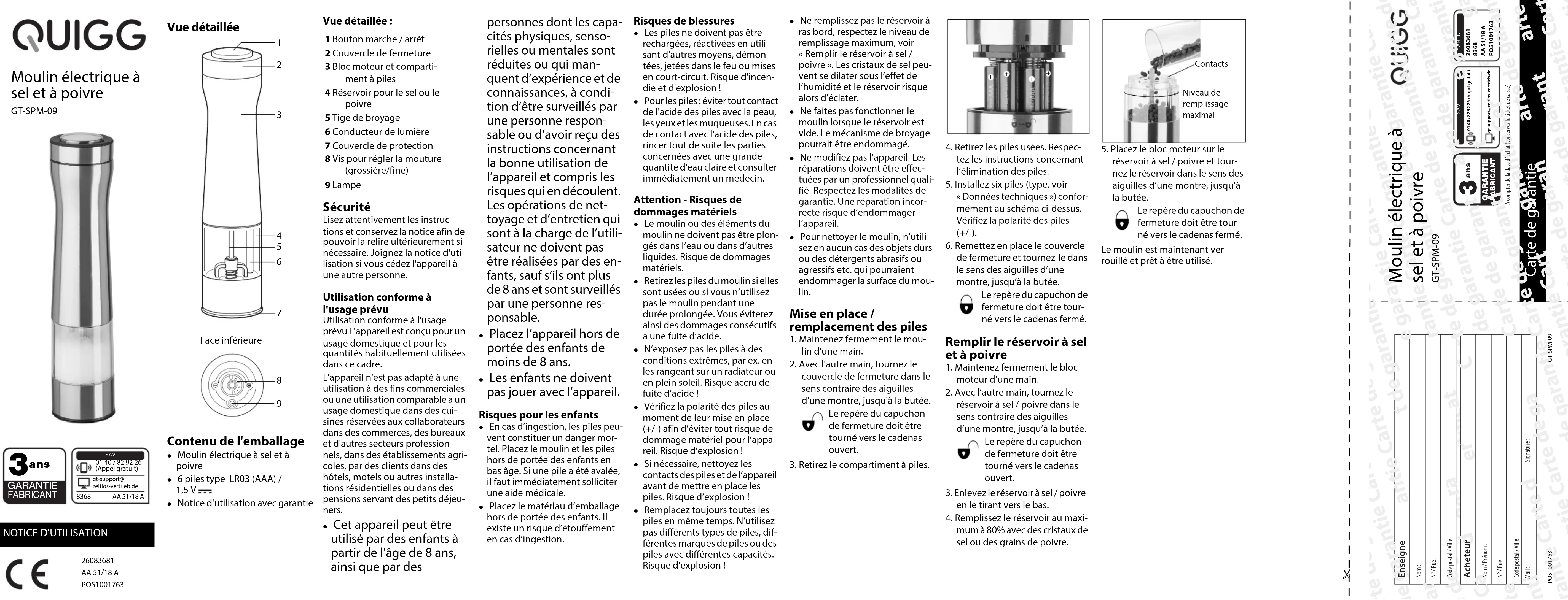 FABRICANT GARANTIE ARTICLE Carte de garantie Moulin électrique à sel et à poivre GT-SPM-0926083681 AA 51/18 APO51001763 gt-support@zeitlos-vertrieb.de 01 40 / 82 92 26 (Appel gratuit)PO51001763GT-SPM-09