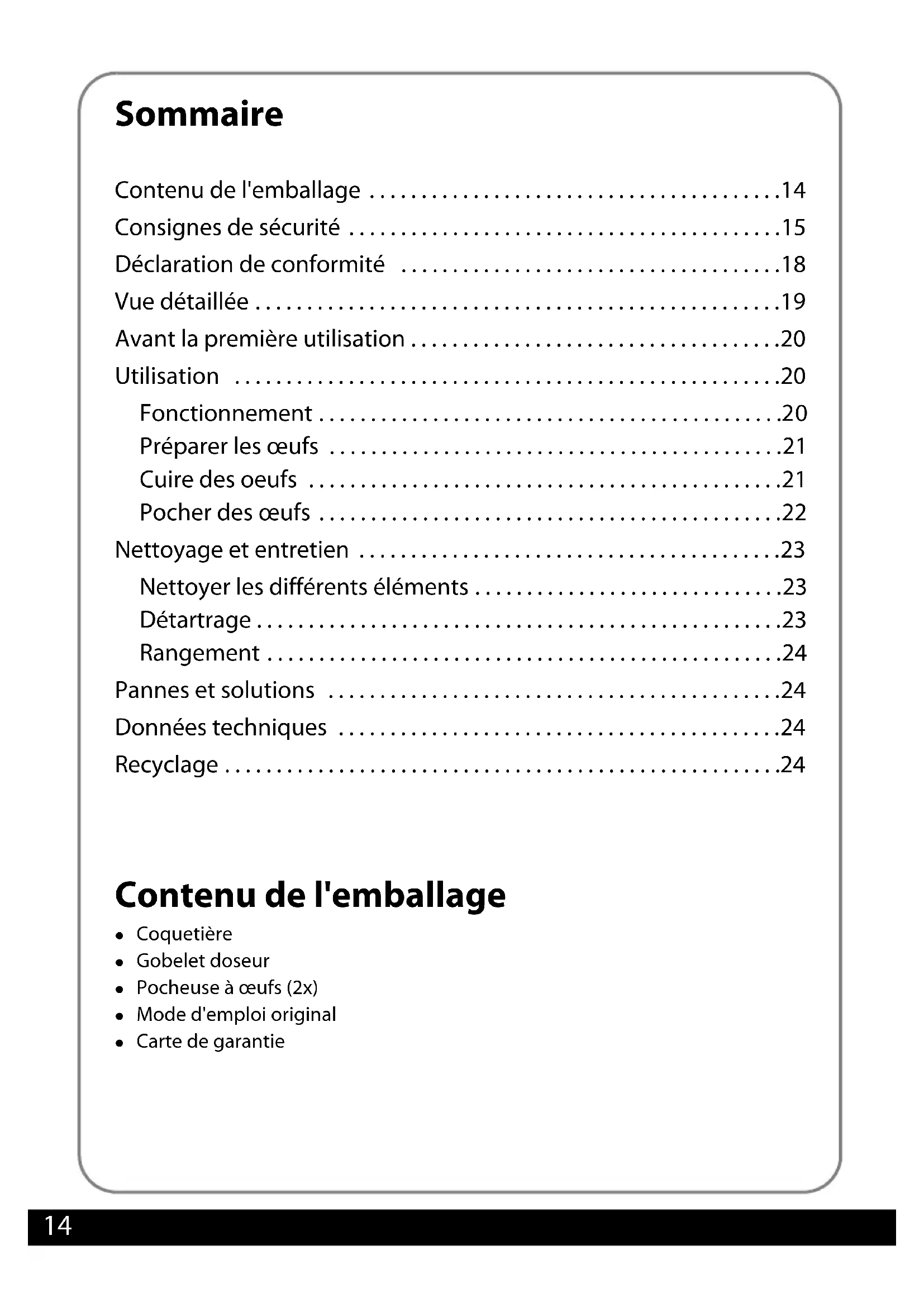 - Recyclage Contenu de l'emballage Coquetière Gobelet doseur Pocheuse à œufs (2x) Mode d'emploi original Carte de garantie Druckbuch Eierkocher BEL.book Seite 14 Dienstag, 6. Oktober 2020 3:32 1515 Consignes de sécurité Lire le mode d’emploi et le conserver Lisez attentivement les consignes qui suivent et conservez ce mode d’emploi afin de pouvoir le reconsulter ultérieurement. Si vous donnez l’article à une autre personne, veuillez également lui remettre ce mode d’emploi. Important Cet appareil peut être utilisé par les enfants à partir de l'âge de 8 ans, ainsi que par des personnes dont les capacités physiques, sensorielles ou mentales sont réduites ou qui manquent d'expérience et/ou de connaissances, à condition d'être surveillés par une personne responsable ou d'avoir reçu des instructions concernant la bonne utilisation de l'appareil et compris les risques qui en découlent. L'appareil et le cordon d'alimentation doivent être placés hors de portée des enfants de moins de 8 ans. Les opérations de nettoyage et d'entretien qui sont à la charge de l'utilisateur ne doivent pas être réalisées par des enfants, sauf s'ils ont plus de 8 ans et sont sous la surveillance d'un adulte responsable. Les enfants ne doivent pas jouer avec l'appareil. Conservez les films plastiques et les emballages hors de portée des enfants. Risque d'étouffement. Ne pas plonger le cuiseur à œufs, le cordon d'alimentation et la fiche d'alimentation dans l'eau ou dans un autre liquide. Risque d'électrocution ! Ne pas utiliser le cuiseur à œufs à proximité de sources d'humidité, par ex. d'un évier. Les composants électriques de la partie inférieure du cuiseur à œufs ne doivent pas entrer en contact avec de l'eau. Installez le cuiseur à œufs de façon à éviter un contact éventuel entre un liquide et Druckbuch Eierkocher BEL.book Seite 15 Dienstag, 6. Oktober 2020 3:32 1516 les connecteurs électriques de l'appareil en cas de débordement. Si le cordon d'alimentation de cet appareil est endommagé, il doit être remplacé par le fabricant ou par son SAV pour éviter un risque éventuel. L'appareil ne doit pas être relié à une minuterie, à un interrupteur crépusculaire ou à un autre système de télécommande. Utilisez l'appareil uniquement comme décrit dans ce manuel. Sinon, il y a un risque de blessure! Utilisation conforme à l'usage prévu Ce cuiseur à œufs est exclusivement conçu pour cuire des œufs de poule. L'appareil est conçu pour un usage domestique, pour les quantités habituellement consommées dans ce cadre. Le cuiseur à œufs n'est pas adapté à une utilisation à des fins commerciales ou une utilisation comparable à un usage domestique dans des cuisines réservées aux collaborateurs dans des commerces, des bureaux et d'autres secteurs professionnels, dans des propriétés agricoles, par les clients dans des hôtels, motels ou autres établissements résidentiels ou dans des pensions servant des petits déjeuners. Un risque de graves brûlures subsiste en cas de manipulation inappropriée de l’appareil. Risque électrique N'utilisez pas l'appareil lorsque vous avez les mains mouillées. N'utilisez pas l'appareil en plein air. Branchez l'appareil á une prise de courant avec terre installée de façon réglementaire, dont la tension est conforme aux « Données techniques ». Assurez-vous que la prise de courant soit facilement accessible afin de pouvoir débrancher rapidement la fiche d'alimentation en cas de besoin. Éteignez toujours le cuiseur à œufs avant d'y verser de l'eau. Ne faites pas fonctionner le cuiseur à œufs sans surveillance. N'utilisez pas l'appareil : Druckbuch Eierkocher BEL.book Seite 16 Dienstag, 6. Oktober 2020 3:32 1517 – si le cuiseur à œufs ou certains de ses composants sont endommagés, – si le cordon d'alimentation ou la fiche d'alimentation est endommagé, – si le cuiseur à œufs est tombé par terre. Déroulez complètement le cordon d'alimentation avant chaque utilisation. Assurez-vous que le câble ne risque pas d'être endommagé par des bords tranchants ou des objets chauds. Débranchez la fiche de la prise de courant : – lorsque vous n'utilisez pas le cuiseur à œufs, – après chaque utilisation, – avant de nettoyer ou de ranger l'appareil, – si une panne se produit manifestement pendant l'utilisation de l 'appareil, –en cas d'orage. –Pour débrancher l'appareil, servez-vous toujours de la fiche d'alimentation sans tirer sur le cordon d'alimentation. Ne réalisez aucune modification sur l'appareil ou sur le cordon d'alimentation. Les réparations doivent être effectuées par un professionnel qualifié, car une réparation non réglementaire de l'appareil peut entraîner des risques pour l'utilisateur. Respectez également les modalités de garantie ci-jointes. N'utilisez pas de rallonge. Risques de brûlures et d'incendie Lorsque l'appareil fonctionne, de la vapeur s'échappe du couvercle. Évitez tout contact avec la vapeur chaude. Risque de brûlure par échaudement ! Ne touchez pas les parties chaudes du cuiseur à œufs à mains nues lorsque l'appareil fonctionne. Utilisez toujours des gants de cuisine anti-chaleur ou des maniques pour manipuler le cuiseur à œufs ainsi que les accessoires. Informez les autres utilisateurs de ces risques. Attention ! De la vapeur chaude peut encore s'échapper du cuiseur à œufs après l'arrêt de l'appareil et certains éléments peuvent encore être très chauds. Laissez toujours refroidir complètement le cuiseur à œufs avant de le nettoyer ou de le ranger. Après le déclenchement du signal sonore, faites attention à la vapeur chaude lorsque vous enlevez le couvercle pour retirez le support à œufs. Si possible, utilisez des gants de cuisine anti-chaleur etc. Avertissement - Risque de blessures Soyez prudent lorsque vous piquez les œufs ou quand vous nettoyez le gobelet doseur. Le pique-œuf est très pointu. Druckbuch Eierkoch