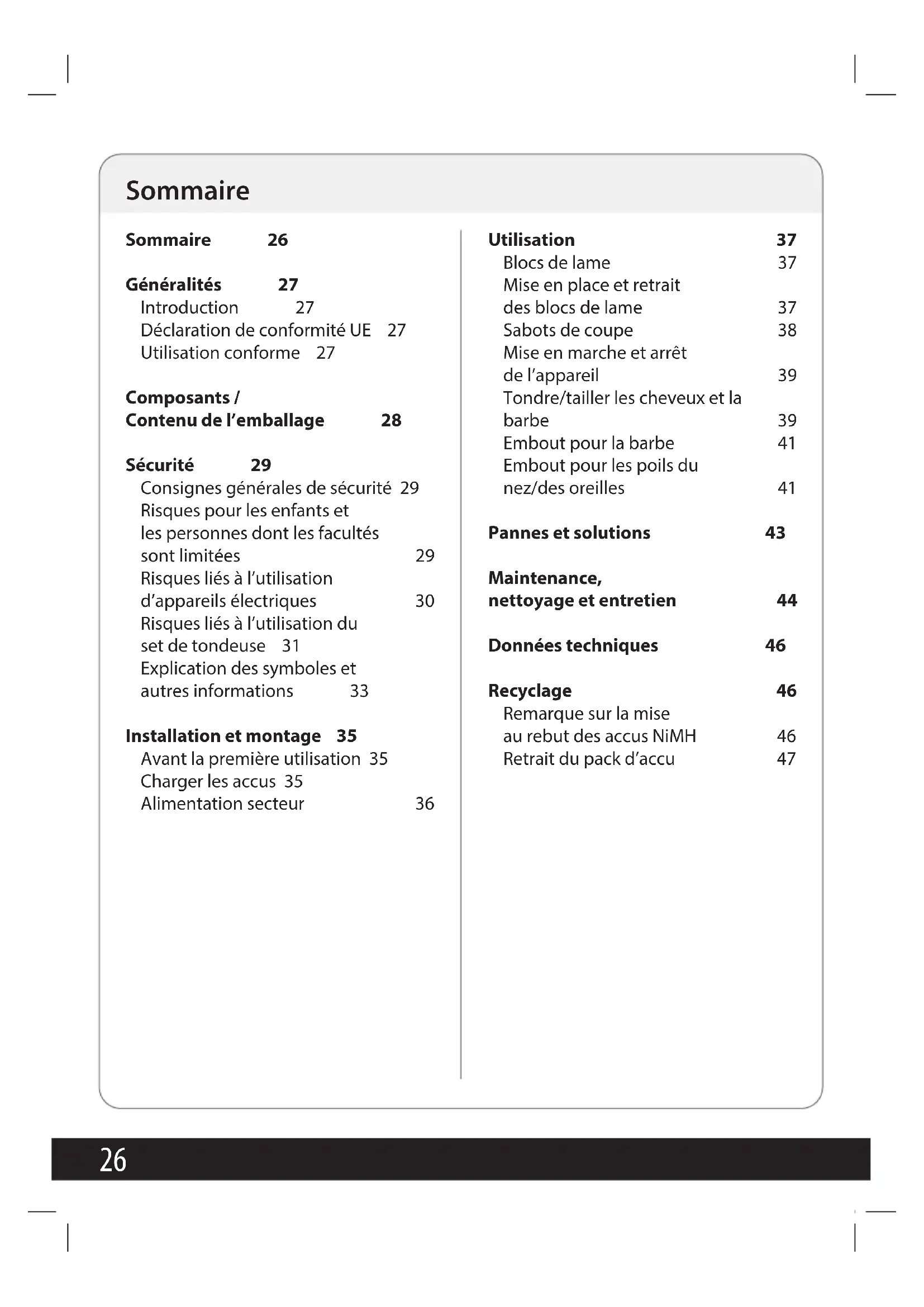 Sommaire 26 Généralités 27 Introduction 27 Déclaration de conformité UE 27 Utilisation conforme 27 Composants / Contenudel’emballage 28 Sécurité 29 Consignes générales de sécurité 29 Risques pour les enfants et lespersonnes dont les facultés sontlimitées 29 Risques liés à l’utilisation d’appareilsélectriques 30 Risques liés à l’utilisation du set de tondeuse 31 Explication des symboles et autresinformations 33 Installation et montage 35 Avant la première utilisation 35 Charger les accus 35 Alimentation secteur 36 Utilisation 37 Blocs de lame 37 Mise en place et retrait des blocs de lame 37 Sabots de coupe 38 Mise en marche et arrêt de l’appareil 39 Tondre/tailler les cheveux et la barbe 39 Embout pour la barbe 41 Embout pour les poils du nez/des oreilles 41 Pannes et solutions 43 Maintenance, nettoyageetentretien 44 Données techniques 46 Recyclage 46 Remarque sur la mise au rebut des accus NiMH 46 Retrait du pack d’accu 47 Sommaire27