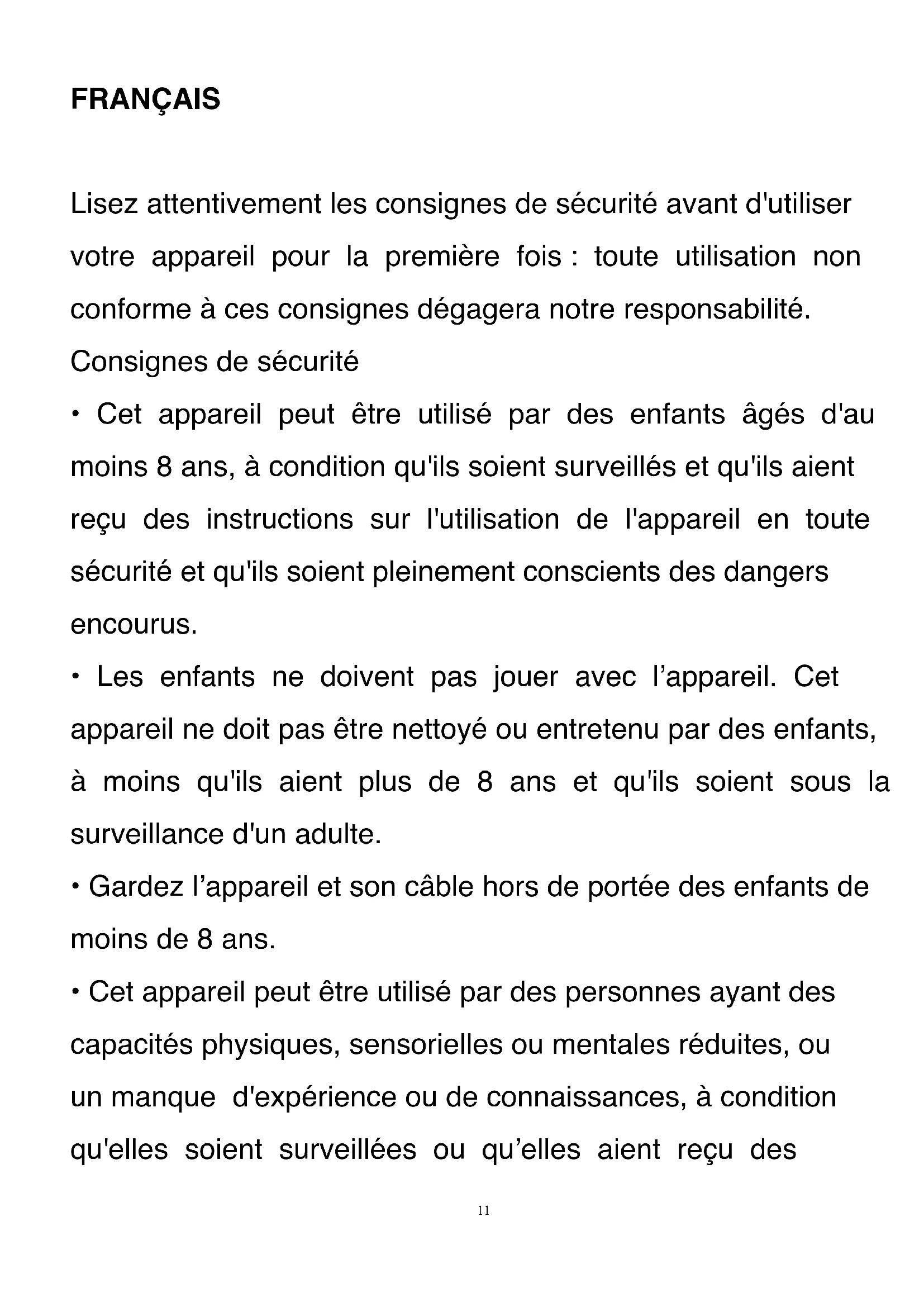 - Les enfants ne doivent pas jouer avec l’appareil. Cet appareil ne doit pas être nettoyé ou entretenu par des enfants, à moins qu'ils aient plus de 8 ans et qu'ils soient sous la surveillance d'un adulte.