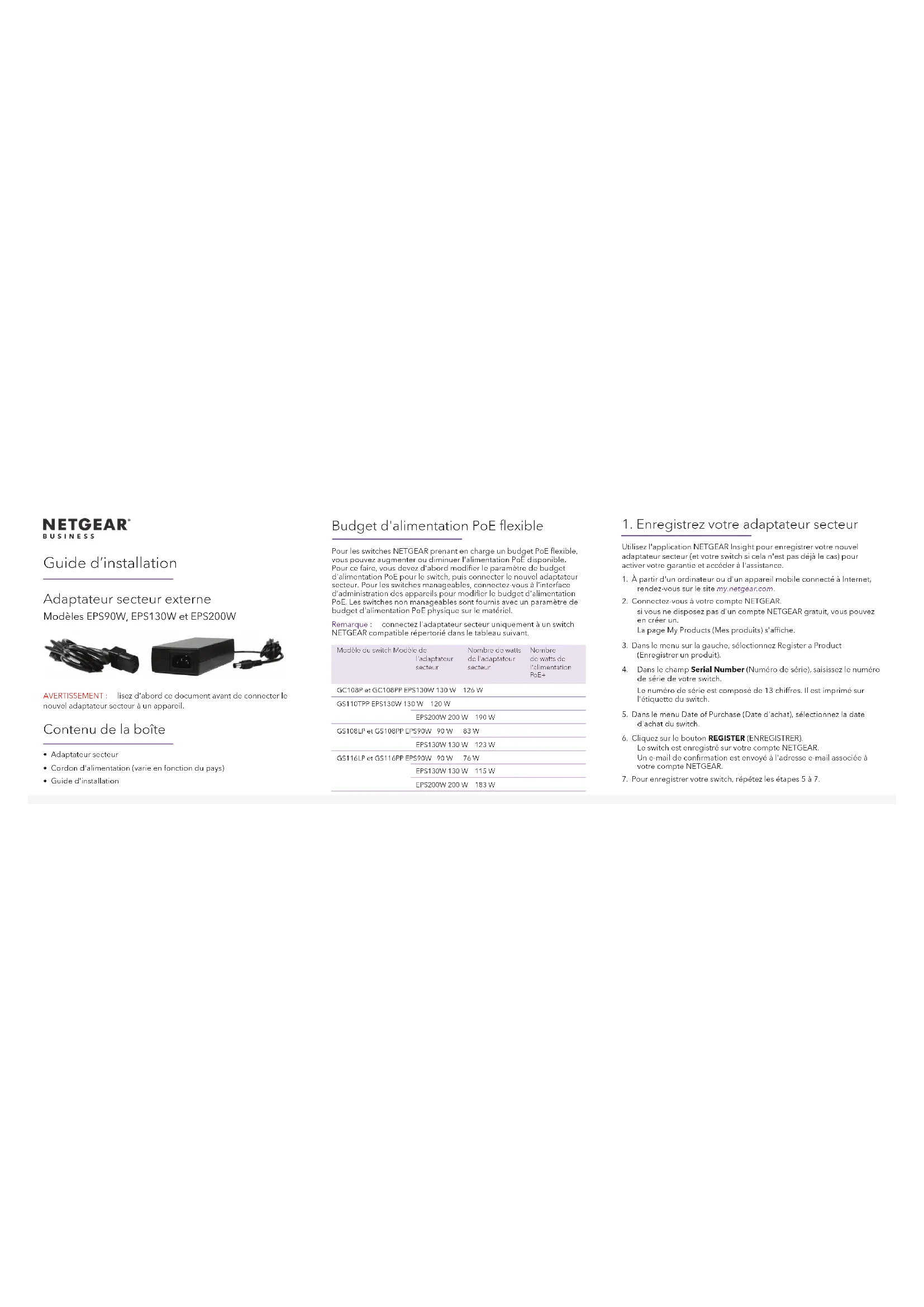 - Guide d'installation Budget d'alimentation PoE exible Pour les switches NETGEAR prenant en charge un budget PoE exible, vous pouvez augmenter ou diminuer l'alimentation PoE disponible. Pour ce faire, vous devez d'abord modier le paramètre de budget d'alimentation PoE pour le switch, puis connecter le nouvel adaptateur secteur. Pour les switches manageables, connectez-vous à l’interface d’administration des appareils pour modier le budget d'alimentation PoE. Les switches non manageables sont fournis avec un paramètre de budget d'alimentation PoE physique sur le matériel. Remarque: connectez l'adaptateur secteur uniquement à un switch NETGEAR compatible répertorié dans le tableau suivant. Modèle du switch Modèle de l'adaptateur secteurNombre de watts de l'adaptateur secteurNombre de watts de l'alimentation PoE+ GC108P et GC108PP EPS130W 130W 126WGS110TPP EPS130W 130W 120WEPS200W 200W 190WGS108LP et GS108PP EPS90W 90W 83WEPS130W 130W 123WGS116LP et GS116PP EPS90W 90W 76WEPS130W 130W 115WEPS200W 200W 183W