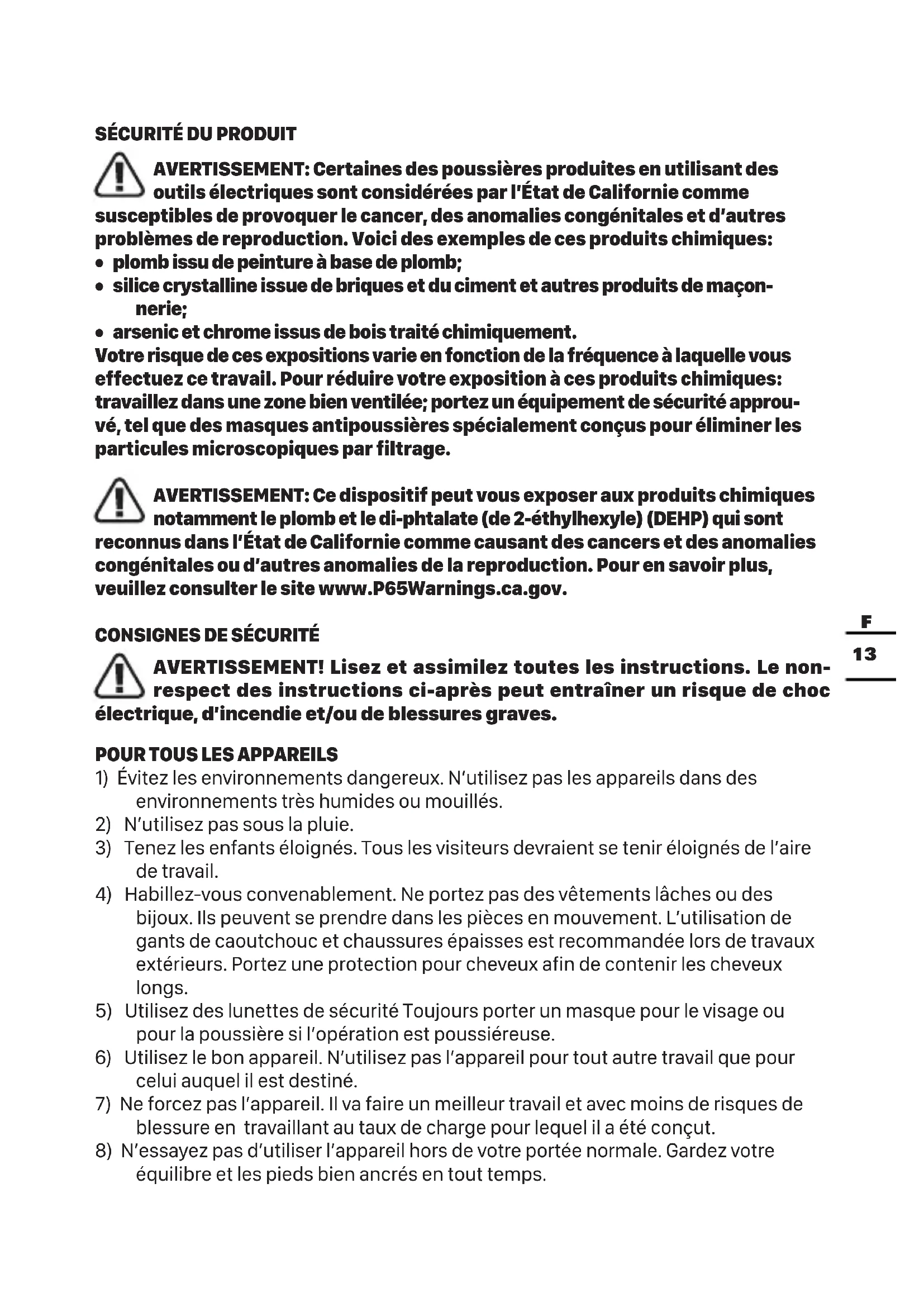 AVERTISSEMENT! Lisez et assimilez toutes les instructions. Le non- respect des instructions ci-après peut entraîner un risque de choc électrique, d’incendie et/ou de blessures graves.