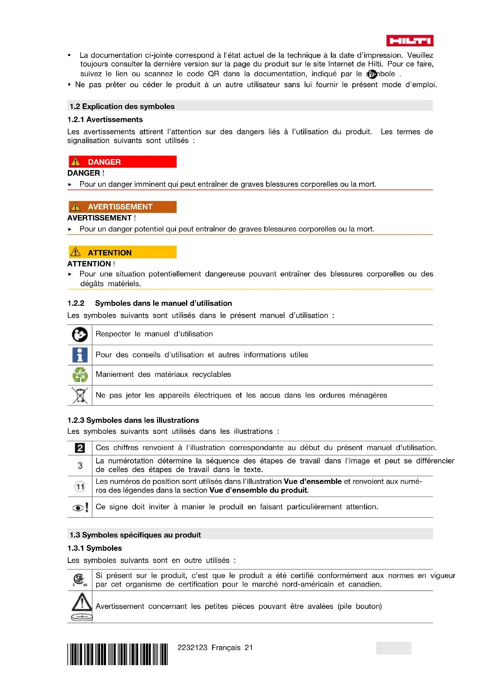 Des informations complémentaires concernant l'utilisation, la technique, l'environnement et le recyclage sont disponibles sous le lien ci-dessous : qr.hilti.com/manual?id=2232123&id=2253454 Ce lien figure également à la fin de la documentation sous forme de code QR.
