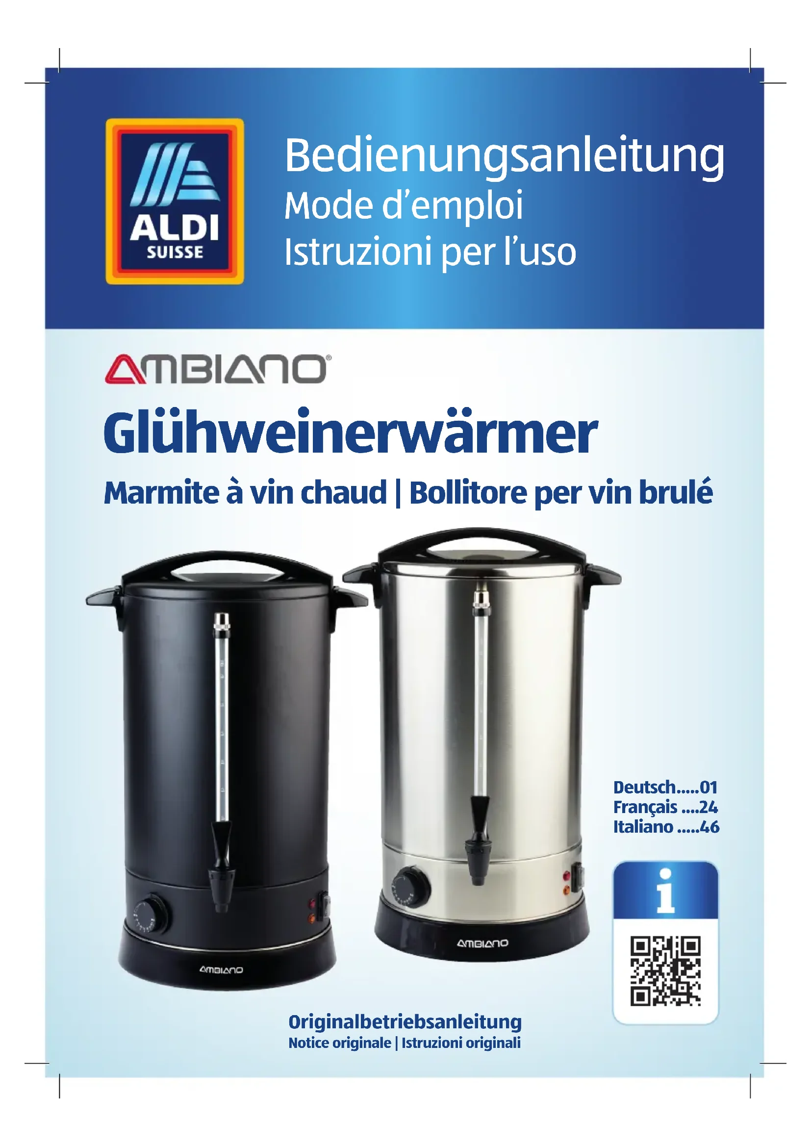 soit bien assurée en bas. Assurez-vous que l’échelle de l’indicateur de niveau soit orientée vers l’avant une fois le tuyau en plastique fixé et qu’elle soit bien visible. Rangement Rangez la marmite à vin chaud après nettoyage dans l’emballage d’origine dans un endroit sec, hors de portée des enfants.43 Pannes et solutions Pannes et solutions Panne : Cause : Solution : L’appareil ne fonctionne pas. La fiche n’est pas reliée à la prise secteur avec terre. Insérez la fiche dans la prise secteur avec terre. Le commutateur marche/ arrêt n’est pas activé. Poussez l’interrupteur marche/ arrêt sur la position «I». La marmite à vin chaud s’est éteinte et ne peut plus être rallumée. La protection anti-sur- chauffe a été activée. Procédez selon les étapes décrites à la section «Réen- clencher le disjoncteur de température». Si le problème rencontré n’est pas énuméré dans ce tableau, merci de contacter notre SAV. Nos conseillers client se feront un plaisir de vous aider. Vous trouverez les coordonnées de notre service client dans la carte de garantie. Etant donné que nos produits sont constamment perfectionnés et améliorés, des modifications techniques et de design sont possibles. Cette notice d’utilisation peut également être téléchargée sous forme de fichier pdf depuis notre site Internet www.gt-support.de.44 Caractéristiques techniques / Déclaration de conformité / Élimination Caractéristiques techniques Tension nominale: 220-240 V~ Fréquence nominale: 50 Hz Puissance nominale: 2000 W Classe de protection: I Niveau sonore: < 70dB Température ambiante: 10°C - 38°C Déclaration de conformité La déclaration de conformité UE peut être demandée à l’adresse indiquée dans la carte de garantie fournie. Les produits portant le symbole CE satisfont aux exigences de toutes les directives CE en vigueur. Élimination Élimination de l’emballage L’emballage du produit est composé de matériaux recyclés. Le matériel d’emballage peut être remis aux centres de tri publics pour être réutilisé. Élimination de l’appareil Les appareils usagés ne doivent pas être jetés avec les déchets domestiques! Selon les prescriptions légales, lorsqu’un appareil n’est plus en état de fonctionner, il doit être amené à un centre de tri attribué. Les matériaux contenus dans l’appareil pourront ainsi être réutilisés et l’environnement préservé. Les autorités communales ou votre centre de tri local vous fourniront des renseignements plus détaillés.45 Aller rapidement et facilement au but avec les codes QR Aller rapidement et facilement au but avec les codes QR Si vous avez besoin d’informations sur les produits, de pièces de rechange ou d’accessoires, de données sur les garanties fabricant ou sur les unités de service ou si vous souhaitez regarder confortablement des instructions en vidéo – avec nos codes QR, vous parvenez au but en toute facilité. Les codes QR, qu’est-ce? Les codes QR (QR = Quick Response) sont des codes graphiques qui peuvent être lus à l’aide d’un appareil photo du smartphone et qui contiennent par exemple un lien vers un site Internet ou des données de contact. Votre avantage: plus de frappe contraignante d’adresses Internet ou de données de contact! Comment faire? Pour scanner les codes QR, vous avez simplement besoin d’un smartphone, d’un lecteur de codes QR installé ainsi que d’une connexion Internet. Vous trouverez généralement un lecteur de codes QR gratuitement dans l’App Store de votre smartphone. Testez dès maintenant Scannez simplement le code QR suivant avec votre smartphone pour en savoir plus sur votre nouveau produit ALDI. Votre portail de services ALDI Toutes les informations mentionnées plus haut sont également disponibles sur Internet via le portail de services ALDI sous www.aldi-service.ch.