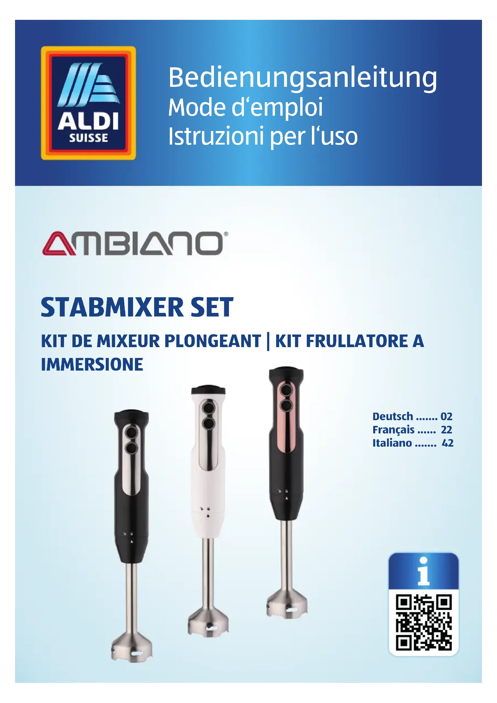 - Lors de l’utilisation du lecteur de codes QR, selon votre tarif, il peut y avoir des frais de connexion internet. Buch_CH_EDS Stabmixer .indb 41Buch_CH_EDS Stabmixer .indb 41 04.06.2021 08:54:5004.06.2021 08:54:5042 Volume di fornitura Volume di fornitura