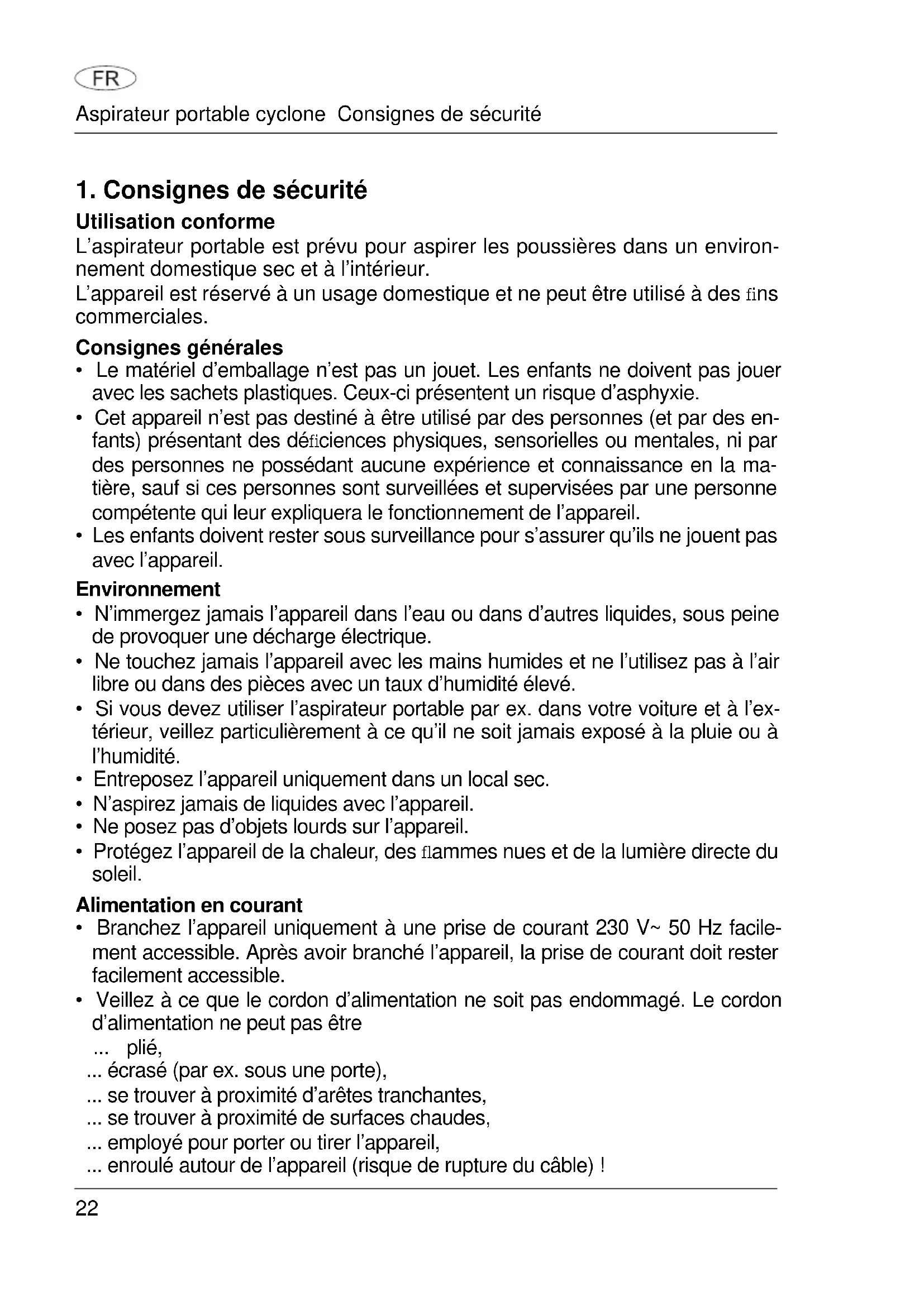 - Veillez à ce que le cordon d’alimentation ne soit pas endommagé. Le cordon d’alimentation ne peut pas être ... plié, ... écrasé (par ex. sous une porte), ... se trouver à proximité d’arêtes tranchantes, ... se trouver à proximité de surfaces chaudes, ... employé pour porter ou tirer l’appareil, ... enroulé autour de l’appareil (risque de rupture du câble) ! Aspirateur portable cyclone Consignes de sécurité23